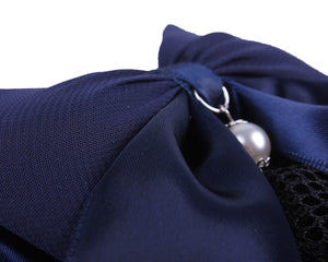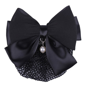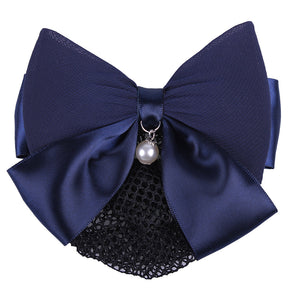 Hair bow with fine mesh net and double satin bow. The upper bow is made of organza. The bow is decorated with a pearl and can be fastened with a barrette clip.