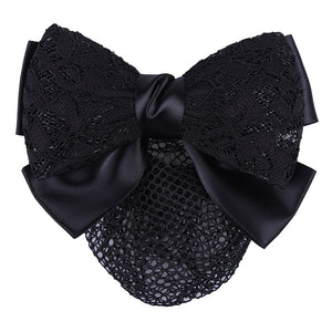 Hair bow with fine mesh net and double bow. The upper bow is made of lace and the lower one of satin. The hairnet can be fastened with a barrette clip.