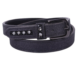 Belt which is fully covered in glitters. The end and the loop are decorated with big silver-coloured and small black rhinestones. The black buckle finishes the chic look.