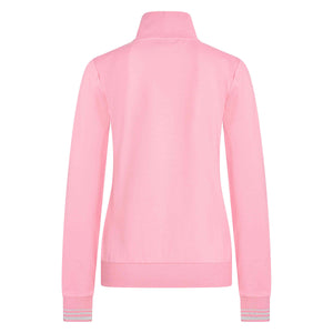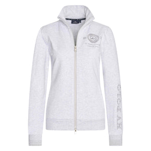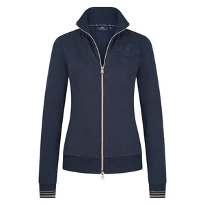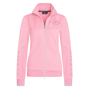 Cotton sweat terry fabric * 2 way zipper * Rib collar, waistband * Rib cuffs with contrast tipping * 2 Insert pockets in side seam * Chique printed artwork with rhinestones on chest * Embroidered artwork with rhinestones on sleeve