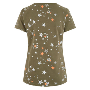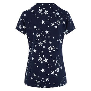 Eye-catching short-sleeved V-neck shirt. This shirt features an all-round pattern with a print mix of stars and the two famous horseshoes. The motifs come in different colours, patterns, and prints. And glitter is a must too, of course. This can be found in the silver stars and the glittering stripe on the inside of the neck. The V-neck features a finely-ribbed border to give its wearer additional comfort. The chest area of this fitted shirt features a trendy foam print with 3D effect into which the logo, the brand, and the text “Ride on” are integrated. Available in two stunningly beautiful colours. Let’s Ride!