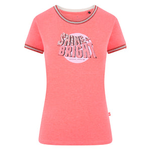 Round neck t-shirt with contrast colored neck- and sleevebindings. With nice artwork in rubber print with sequins on top. With brand labels in sideseam and on sleeve and a fancy neckprint.