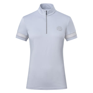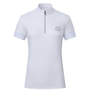 Half zip top * Standing collar * Short sleeves with mesh inserts * Rhinestones artwork at chest wearers left * Branded puller