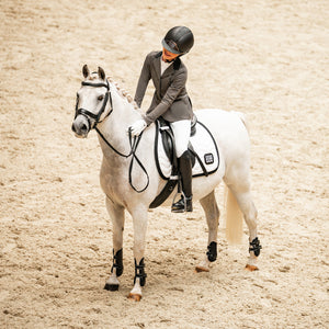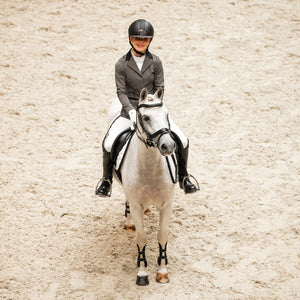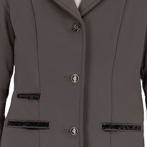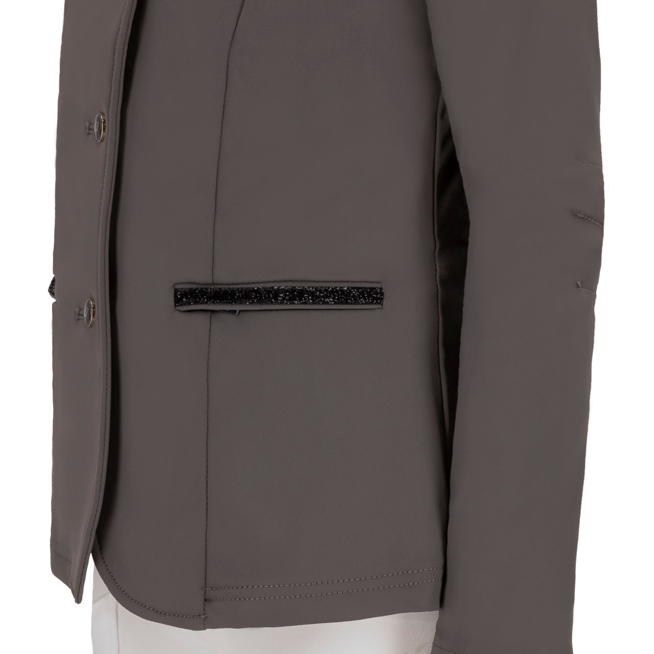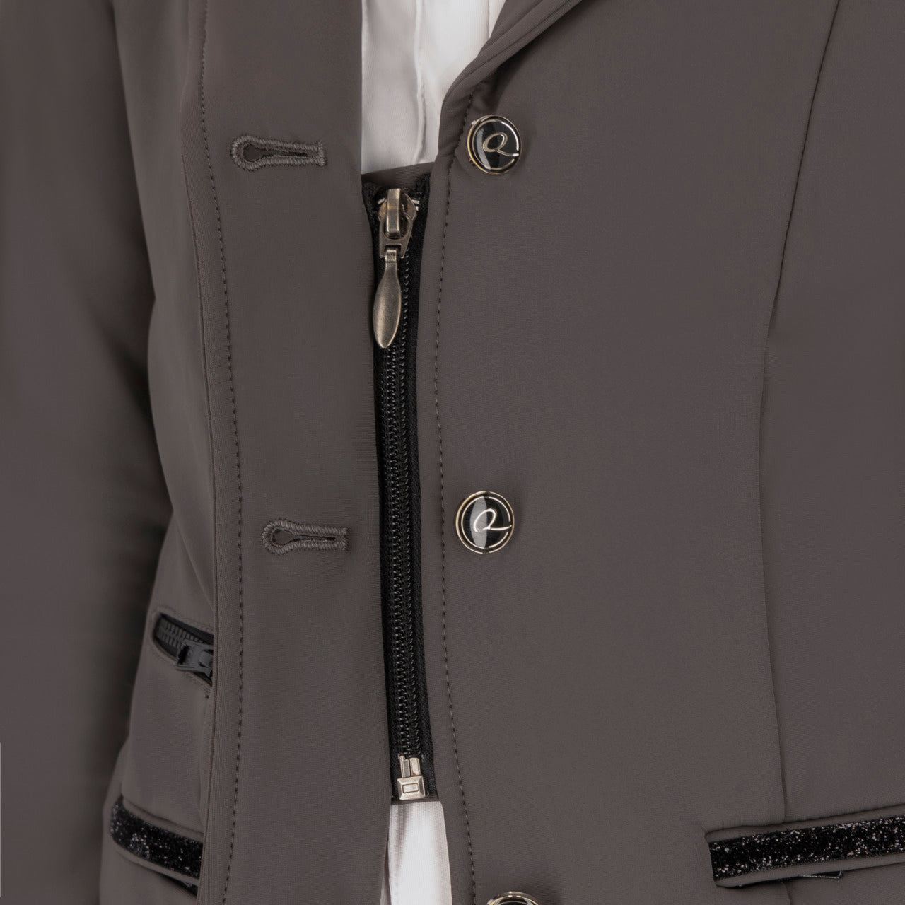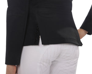 Shine during your competition with this chic competition jacket. The jacket has a concealed zip behind the button closure so that the buttons won't pull. The stretchy, breathable fabric ensures a comfortable ride and is also water-repellent. The glitter tape on the zip pockets and black faux zip pocket complete the jacket.