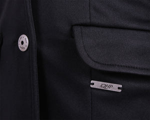 Basic competition jacket Robin Junior is made of a light stretching fabric. The jacket features a button closure with "Quality Horse Products" buttons. The same buttons are placed on both sleeves. The back features a double vent. The jacket is finished with a metal QHP badge under the left pocket in the front.