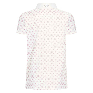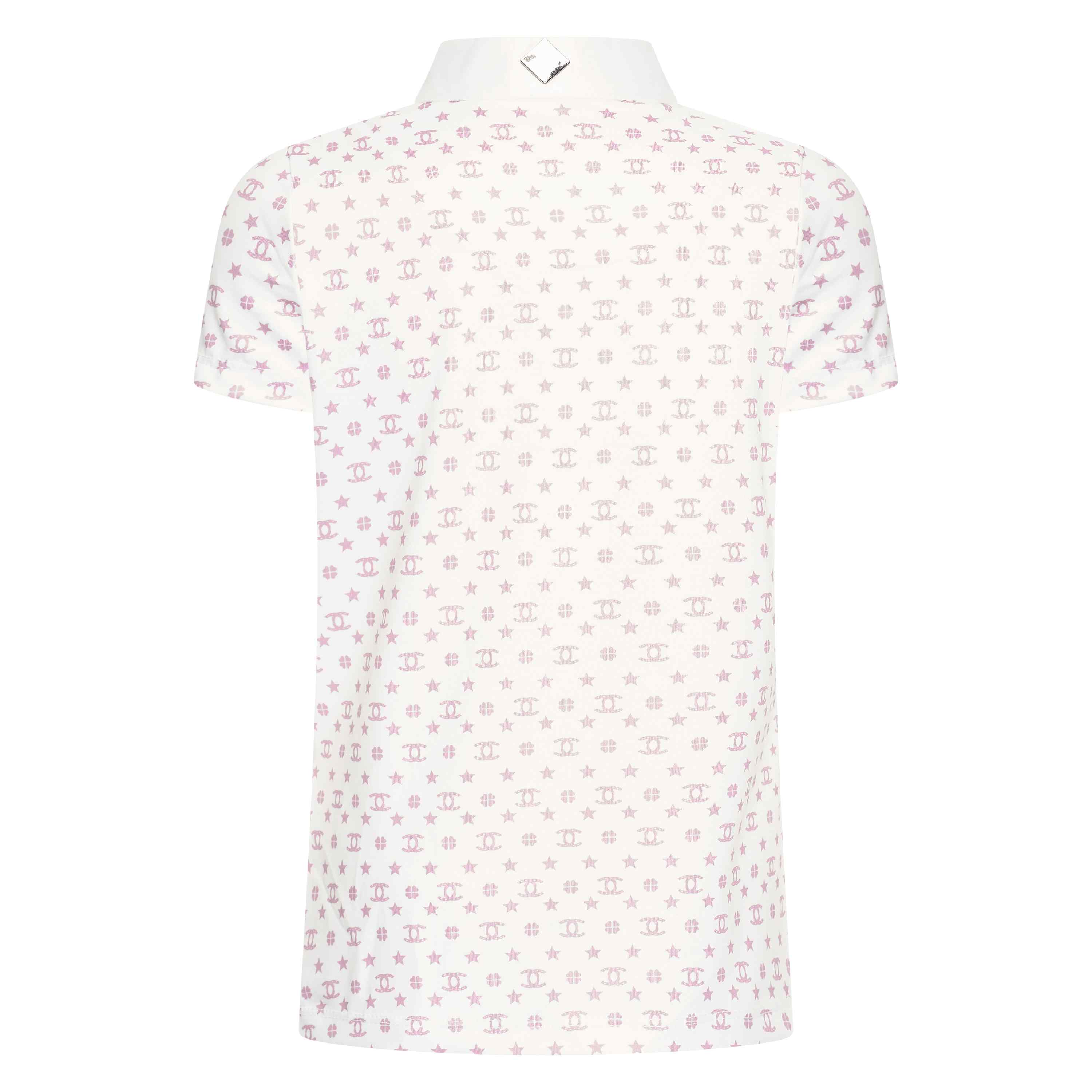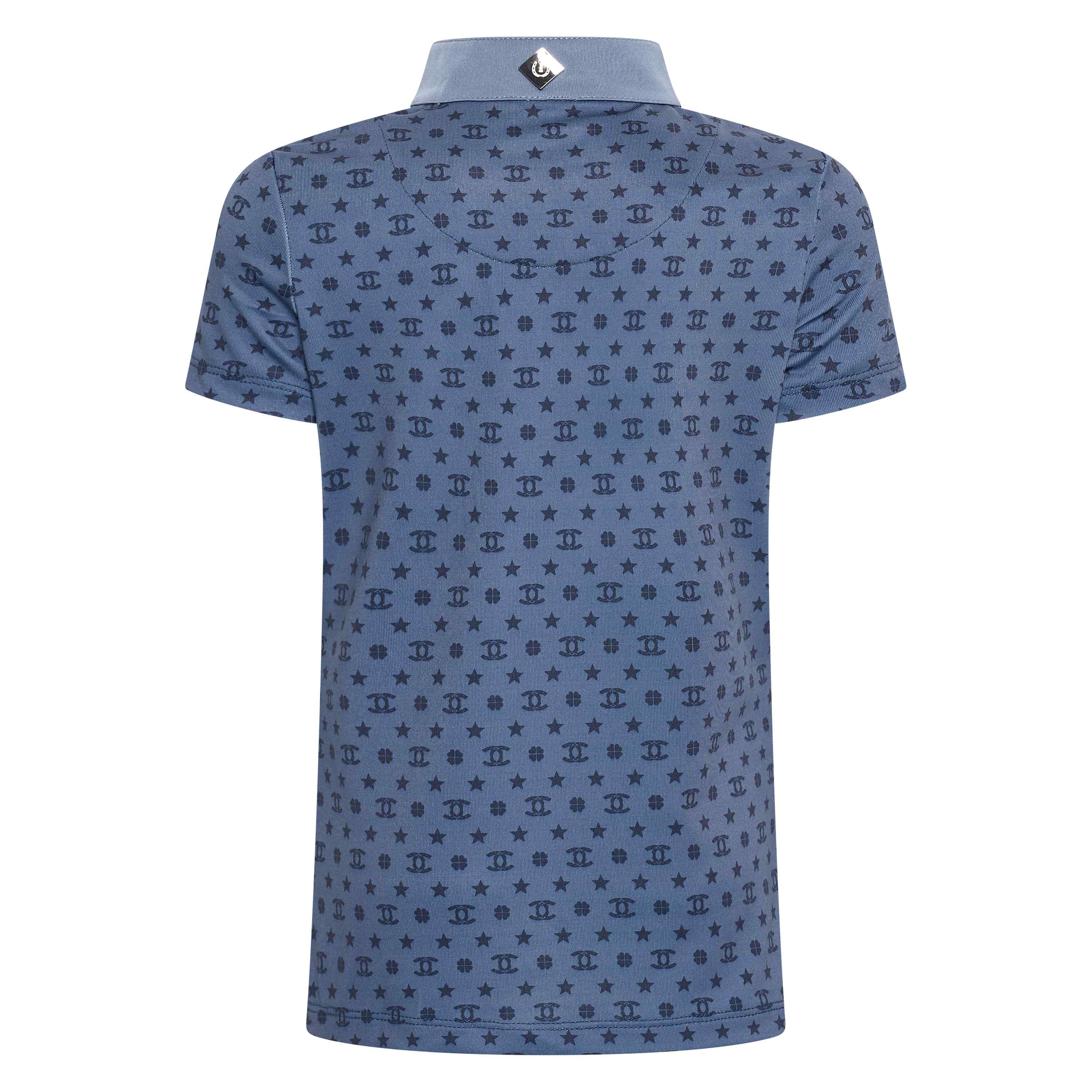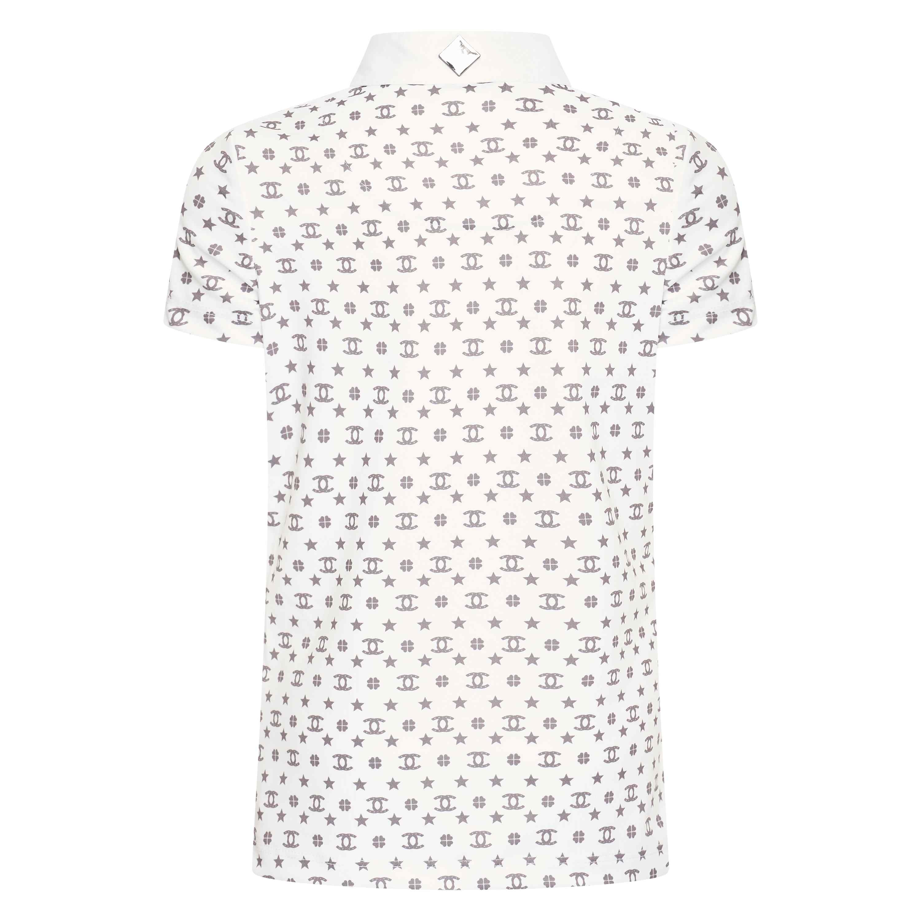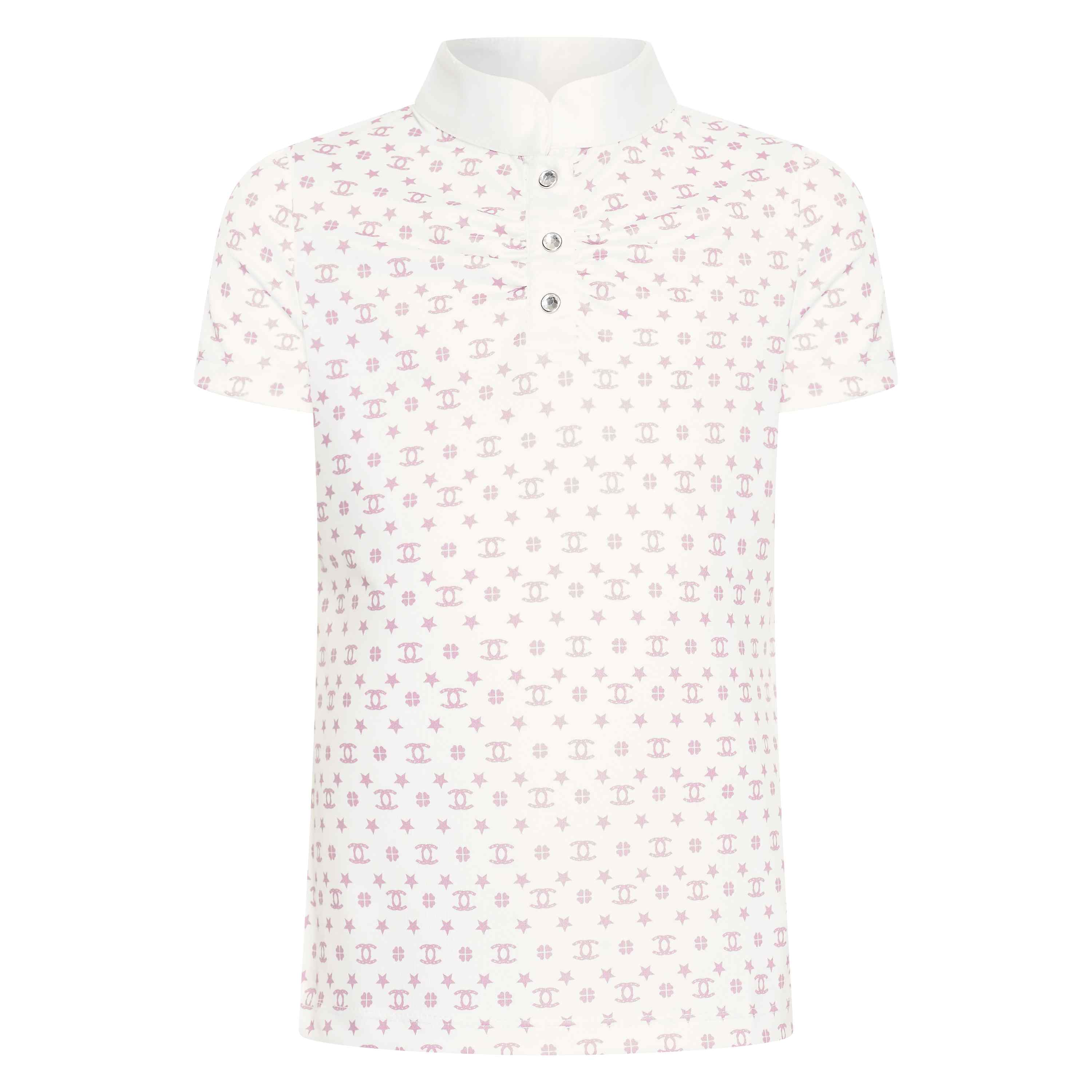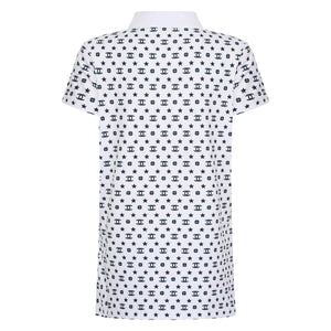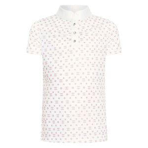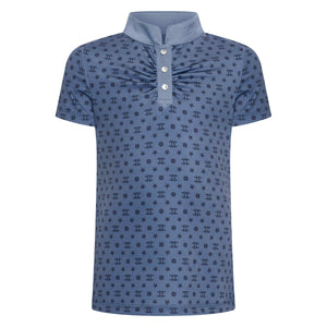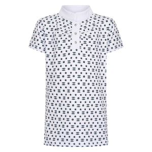 Competition top * Body and sleeve white ground with navy printed * White collarstand with IMPERIAL RIDING logo centreback * Short slit centrefront with fancy rhinestone buttons * Gathering at chest
