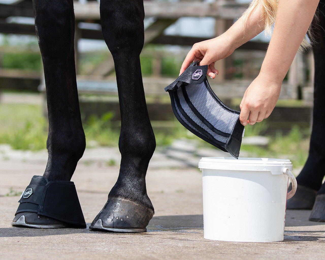 Some horses suffer from dry, crumbly hooves. An aqua boot can help to moisten the hooves and prevent crumbling. Three layers of moisture absorbing material slowly disperse the moisture to the hooves. Available in a set of two boots.