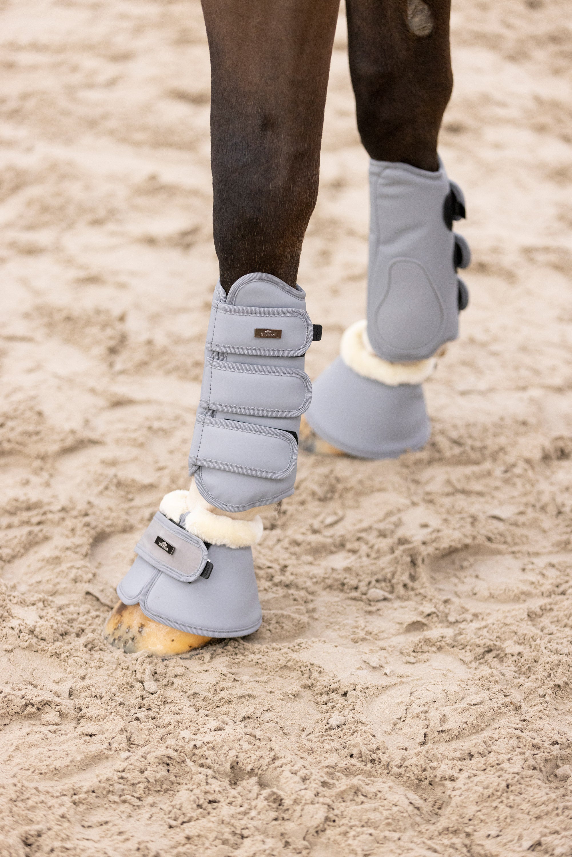 Bellboots made out of PU material with a strap of fake memory material. The bellboots has a faux fur lining with small metal plate and rubber label at closure strap.