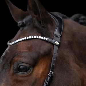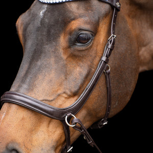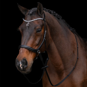 Sidepull bridle made from 100% soft leather * The headpiece is anatomically shaped to offer extra ear flexibility and has a super soft padding * The browband is beautifully decorated with crystal rhinestones and is softly padded on the inside for increased comfort * With HV Polo metal logo on browband * Including web reins with leather stops