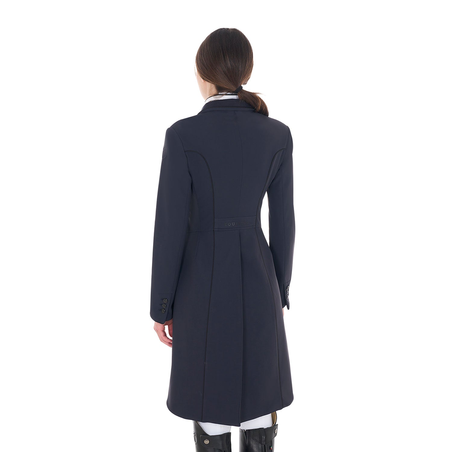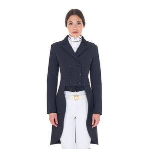 Dressyrfrack för dam i smal passform, tillverkad i högkvalitativa funktionsmaterial. Dessa material ger oöverträffad komfort, rörelsefrihet och andningsförmåga. Den dubbelknäppta modellen har sex knappar för en elegant knäppning, medan ärmsluten är dekorerade med tre knappar. Frackens skörtar är utrustade med avtagbara vikter för att säkerställa maximal stabilitet under prestationen. Plagget kombinerar en ergonomisk design, idealisk för sport, med den distinkta elegans som kännetecknar Equestro.