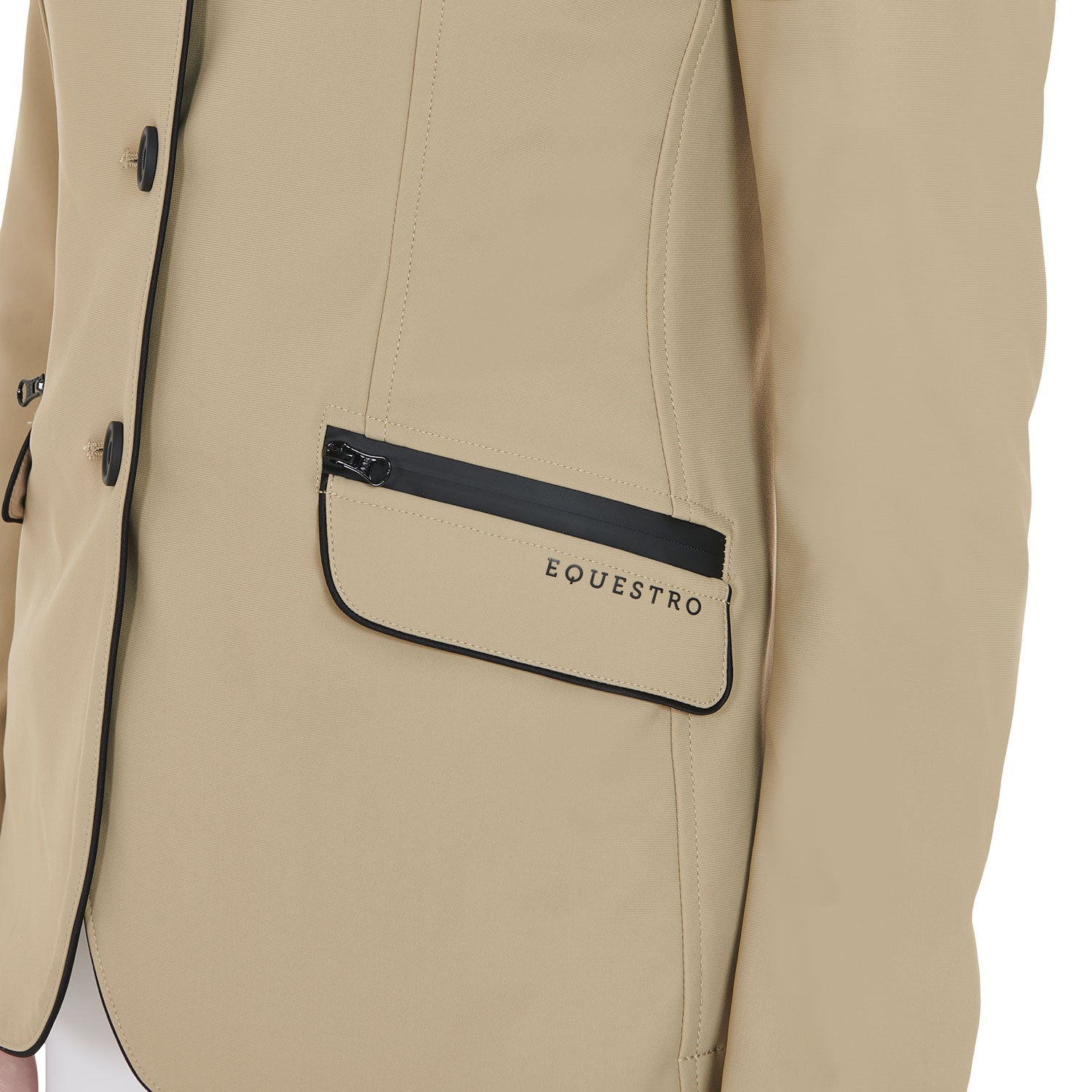 Tävlingskavaj för dam med en klassisk och elegant skärning, i högpresterande tekniskt material och avslutad med kontrasterande inlägg. Den höga andningsförmågan och den eleganta passformen gör den till ett oumbärligt plagg för ryttaren som vill uttrycka sin stil under tävlingar. Det innovativa och vattenavvisande tekniska materialet främjar en hög värmeisolerande förmåga. Plagget är utrustat med knäppning med tre knappar, främre bälgfickor med vindtät och vattentät dragkedja samt ärmslut med tre knappar.