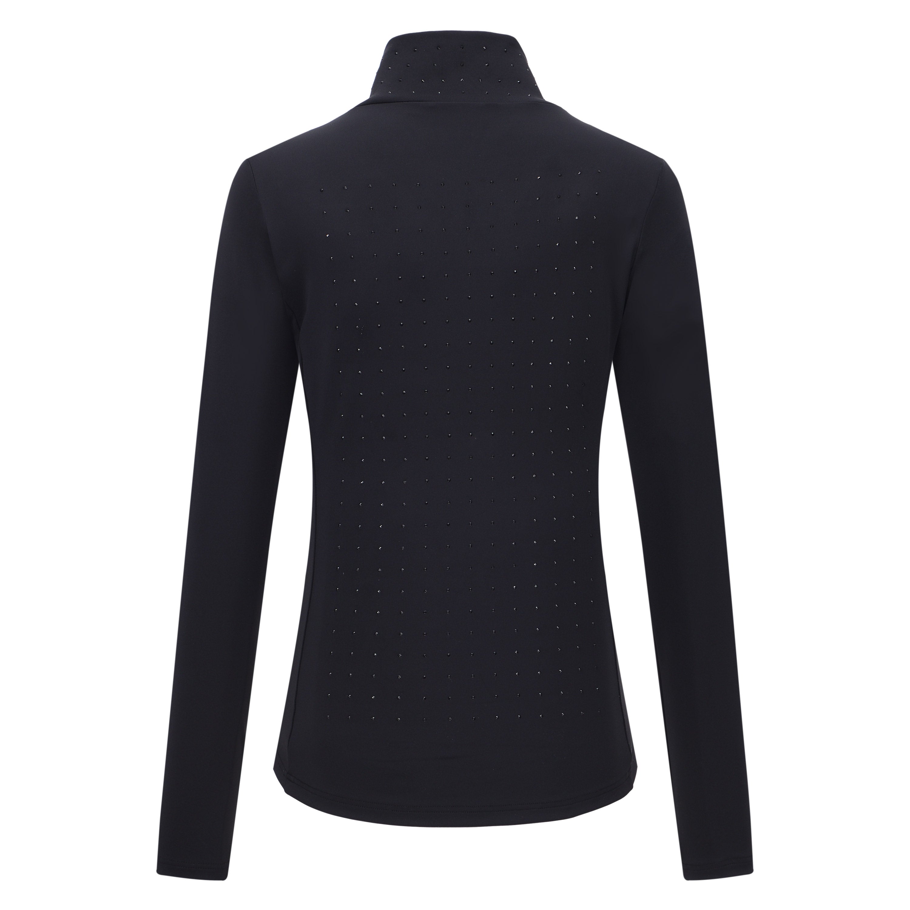 Turn heads and sparkle from stable to saddle with the IRH-Belle Sparkle Top. Designed for the confident rider who blends glamour with functionality, this sophisticated long-sleeved top effortlessly combines equestrian elegance with contemporary fashion. With dazzling rhinestones adorning the front panel for a subtle shimmer, and a chic half-zip design with collar stand, it's perfect for riders who want their style to reflect their individuality and passion for riding. Enhanced by the subtle touch of a metallic star coin at the left hem, every ride becomes an occasion to shine.