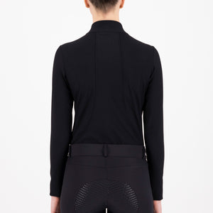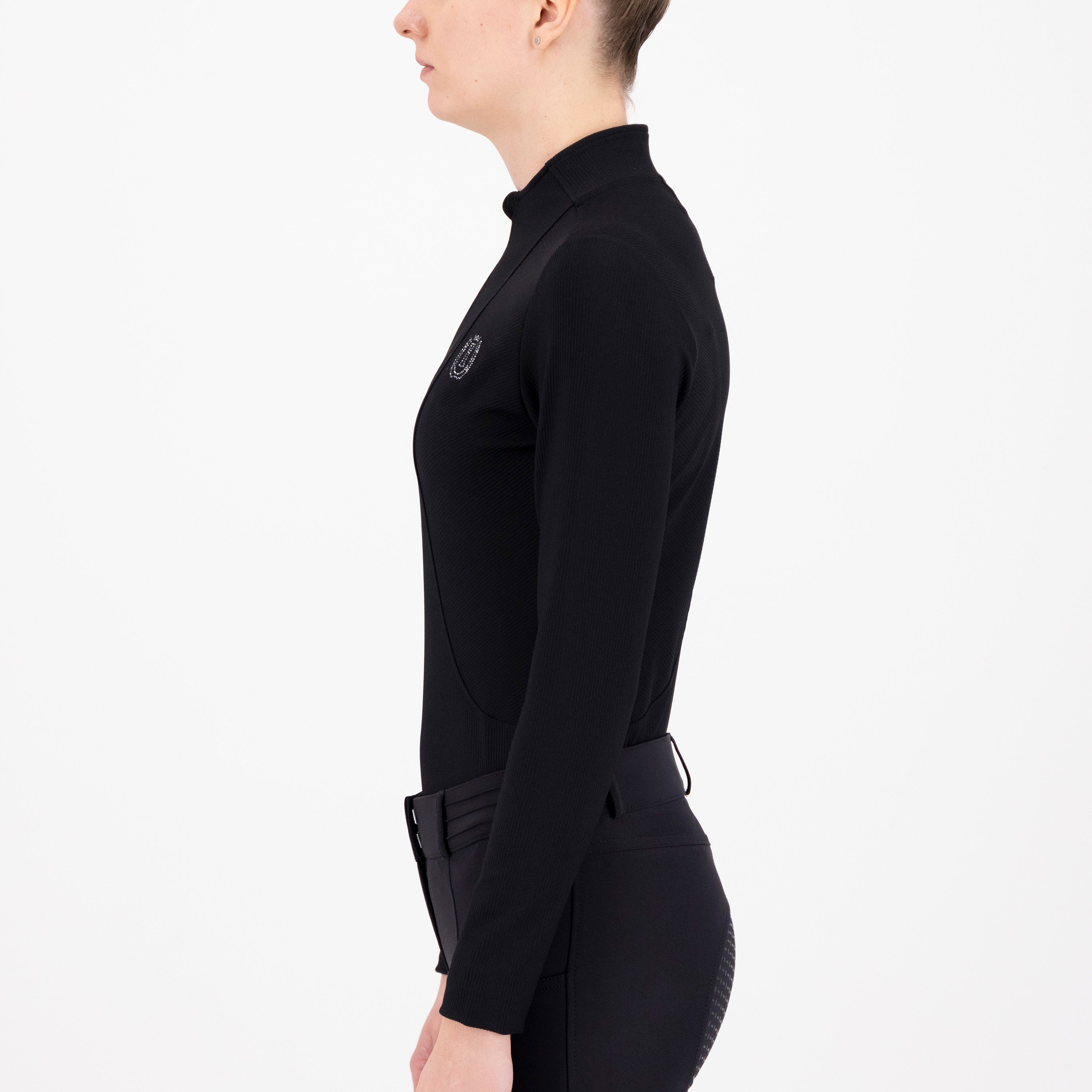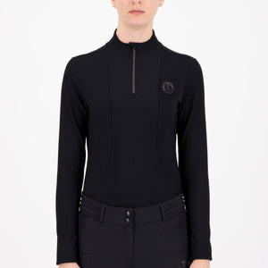Add a touch of sparkle to your athletic wardrobe with our Rib Jersey Half Zip Tech Top. This sleek and stylish top features a small collar and long sleeves for added coverage during your workout. The shaped hem creates a flattering fit, while the rhinestone embellished logo at the chest adds a touch of glamour. Complete with a branded metal charm at the bottom, this top is perfect for both performance and style. Upgrade your activewear collection with our Rib Jersey Half Zip Tech Top today.
