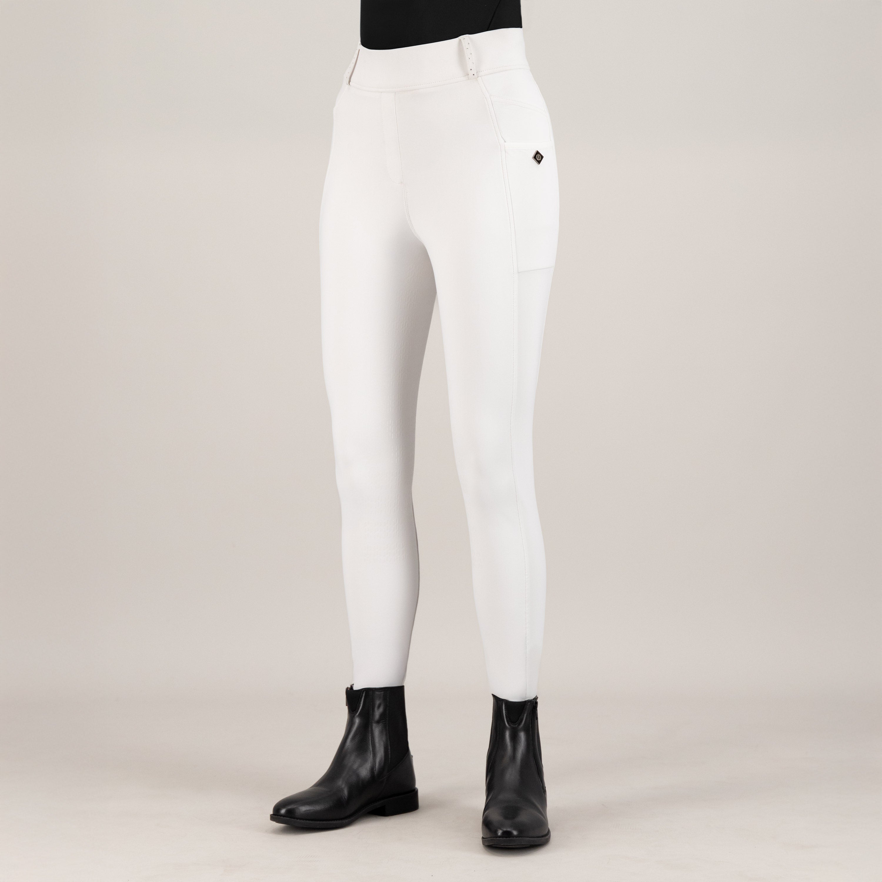 Ready to truly shine in the arena? The IRH-Tamara Competition Riding Tights are designed for riders who refuse to blend in. These aren't just any white competition tights; they're your secret weapon for a confident performance. Crafted with a premium, four-way stretch fabric, you'll experience ultimate freedom of movement and a no-see-through guarantee, so you can focus entirely on your ride. The elastic waistband ensures a snug, comfortable fit, while the cleverly placed phone pockets on each side keep your essentials secure and easily accessible. And for that unmistakable Imperial Riding touch of glamour? You'll find dazzling crystal rhinestones on the front belt loops and a chic metal coin detail on the right pocket. Ride bold, ride brilliant!