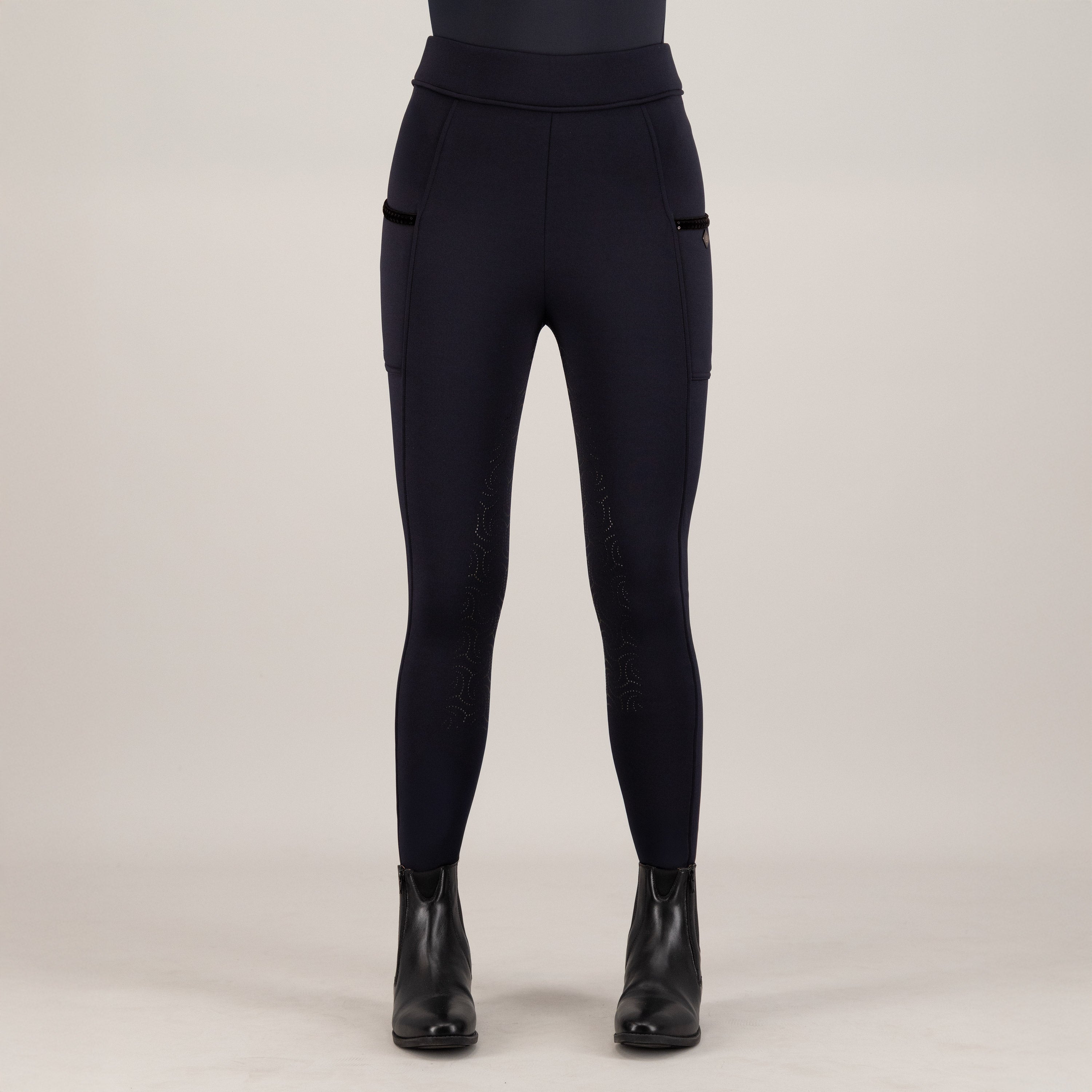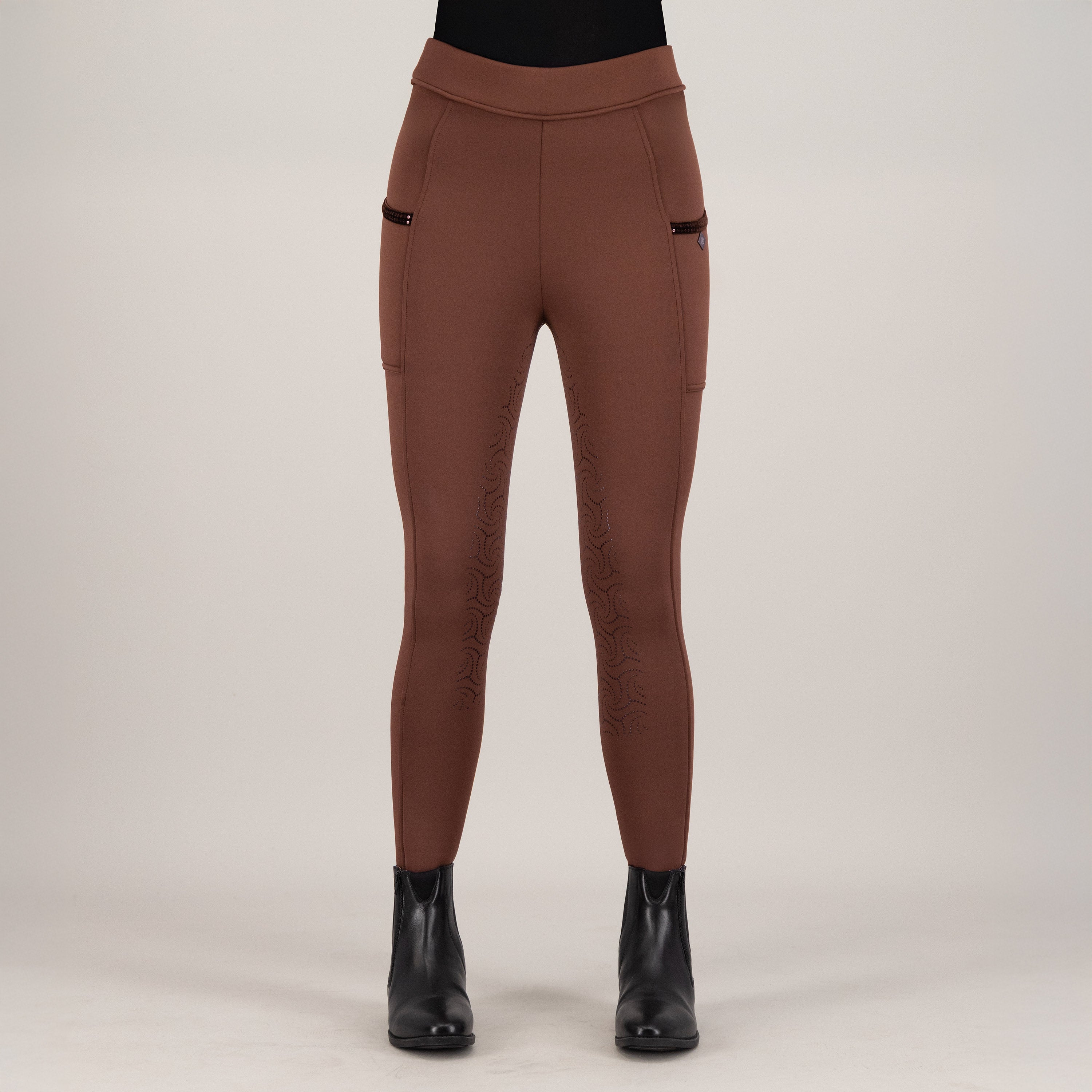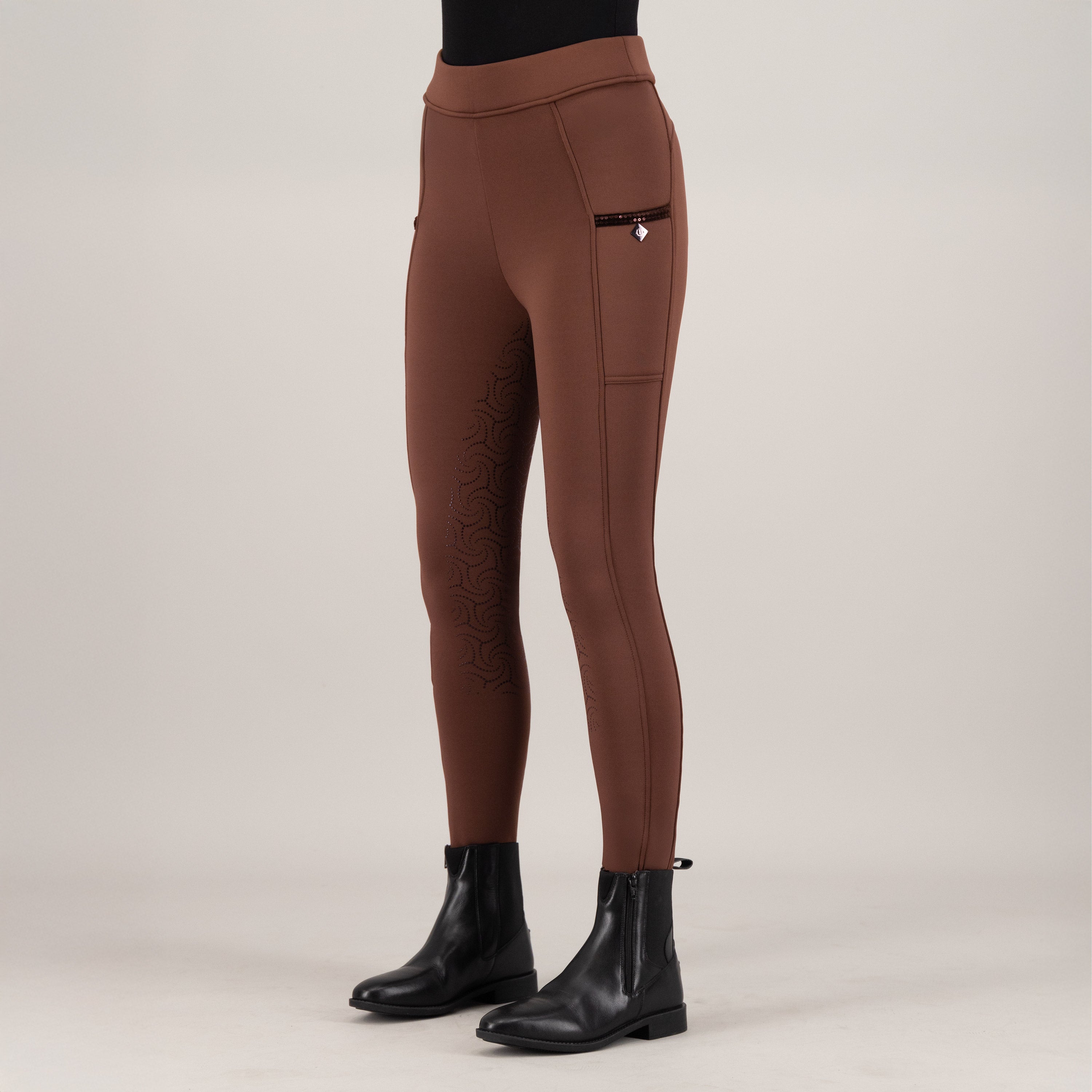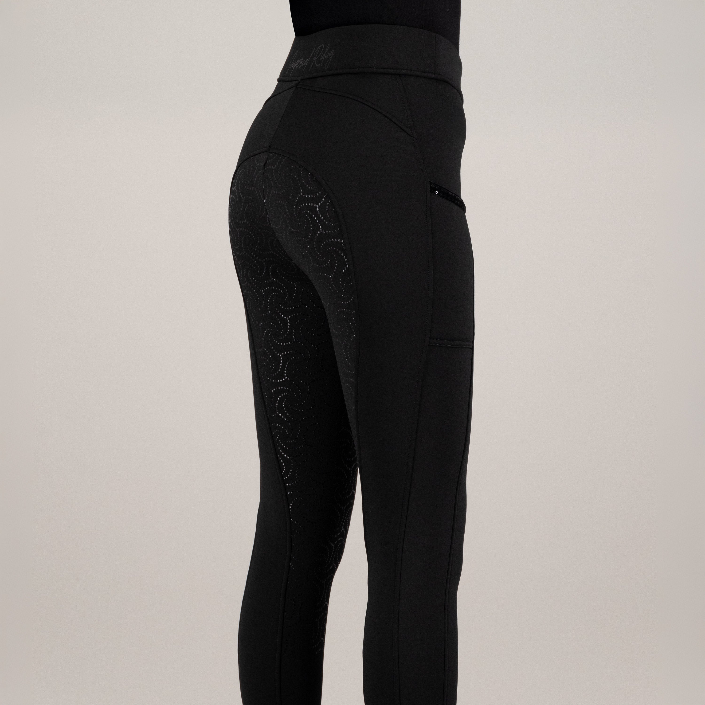 Imagine slipping into these incredibly soft tights – they're brushed inside, so you'll stay wonderfully warm even on cooler days, making every ride a delight. The fancy silicone full grip ensures you've got amazing stability in the saddle, whether you're schooling dressage or hitting the jumping arena. And let's talk about the details! With phone pockets on both sides, adorned with a chic velvet tape and dazzling sequins, your essentials are always within reach, adding a touch of glamour to your equestrian look. The high waistband, featuring a colour-matched IMPERIAL RIDING print at the centre back, offers fantastic support and a flattering silhouette, all while stretchable seams ensure maximum freedom of movement. These aren't just riding tights; they're your statement piece for fun and confidence, perfect for the rider who loves to shine.