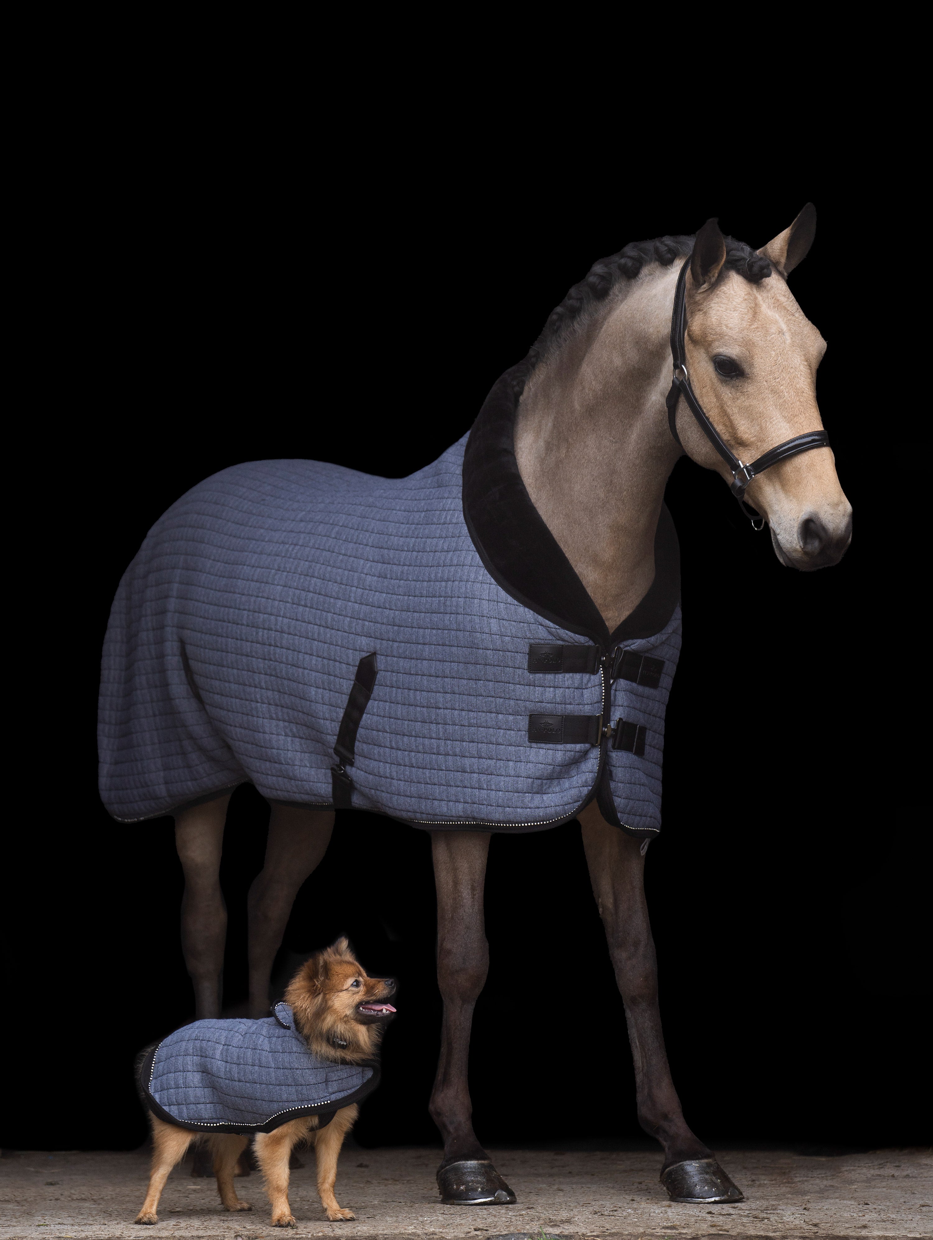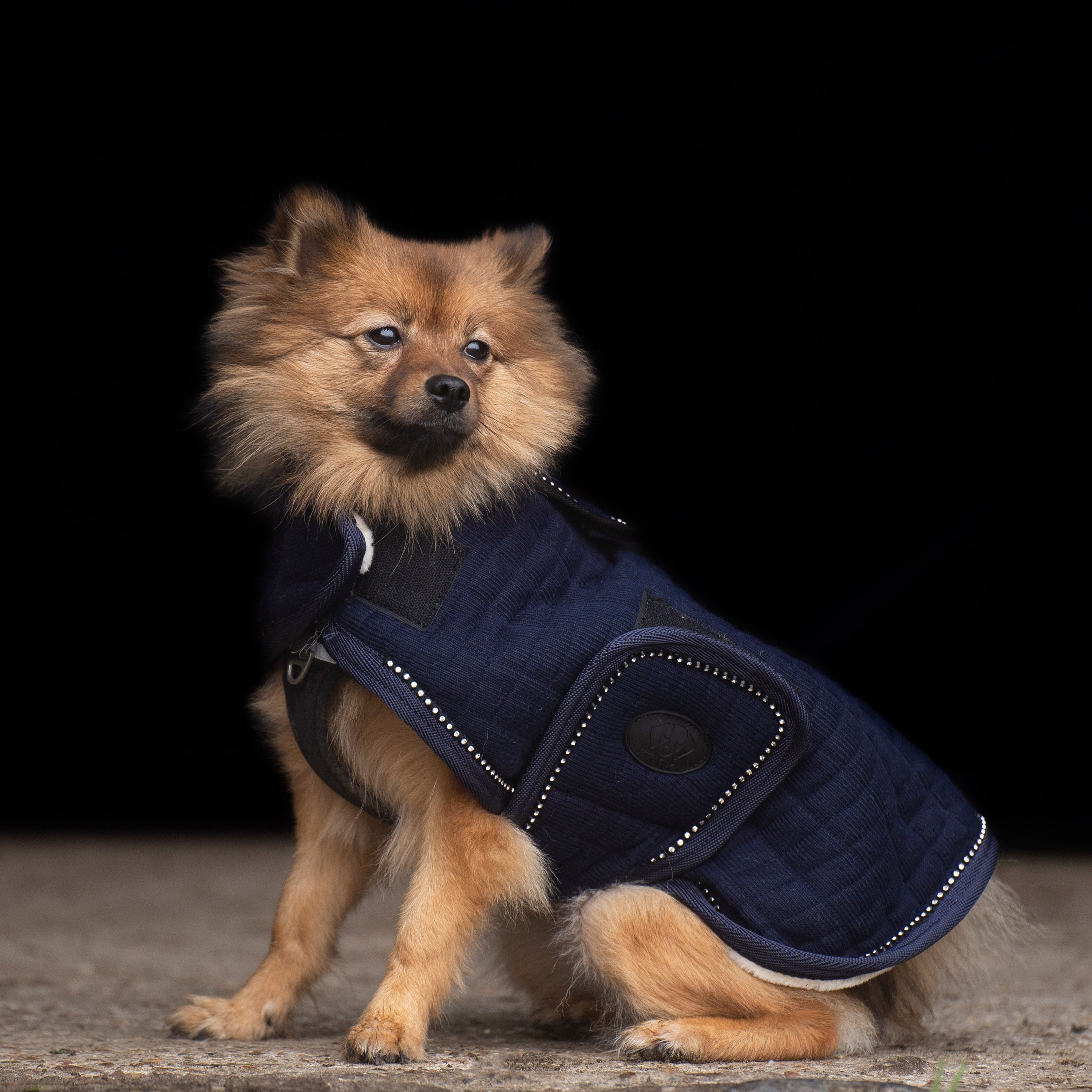 Wool look material outside * Faux fur lining inside * Velcro front closure * Belly flap with velcro closure * Elastics at hind legs * Fancy rhinestone details * Branded rubber badge * Washable