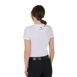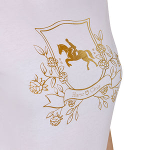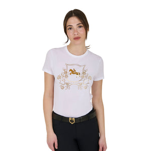 The design is enhanced by a refined, college-style gold foil print featuring the Horse Club lettering and the college-style Equestro logo, giving the garment a distinctive and sophisticated touch. The fabric composition ensures an elegant texture and a soft touch, making this T-shirt not only functional but also extremely pleasant to wear.