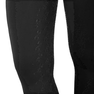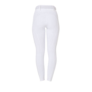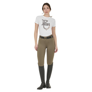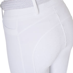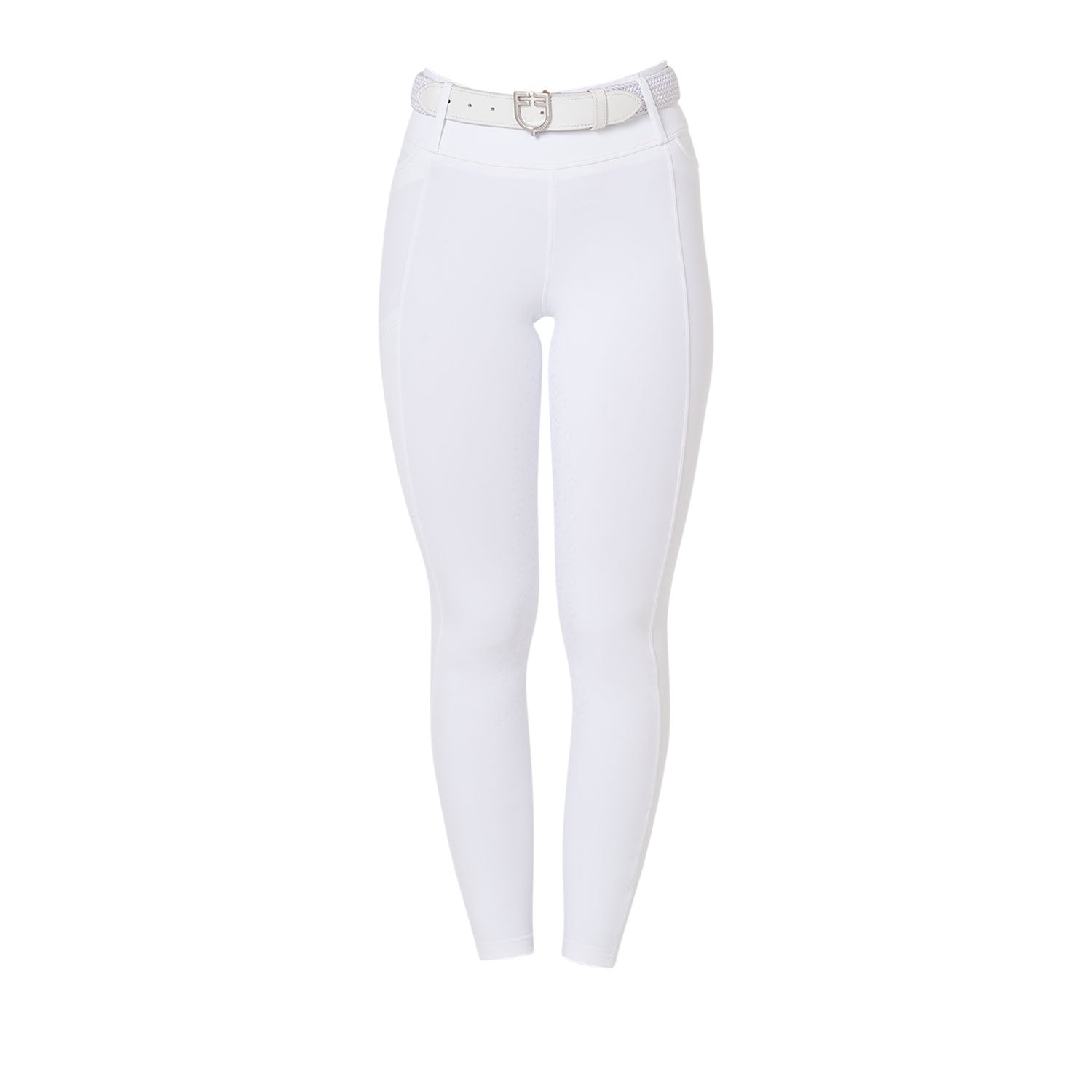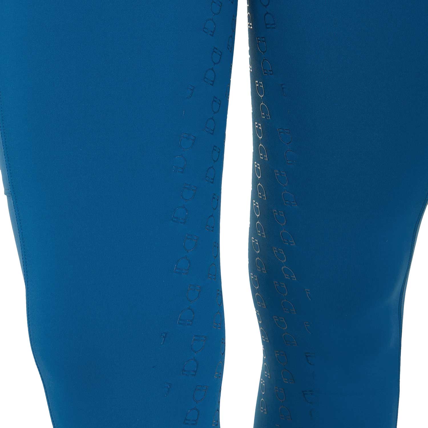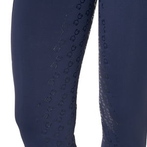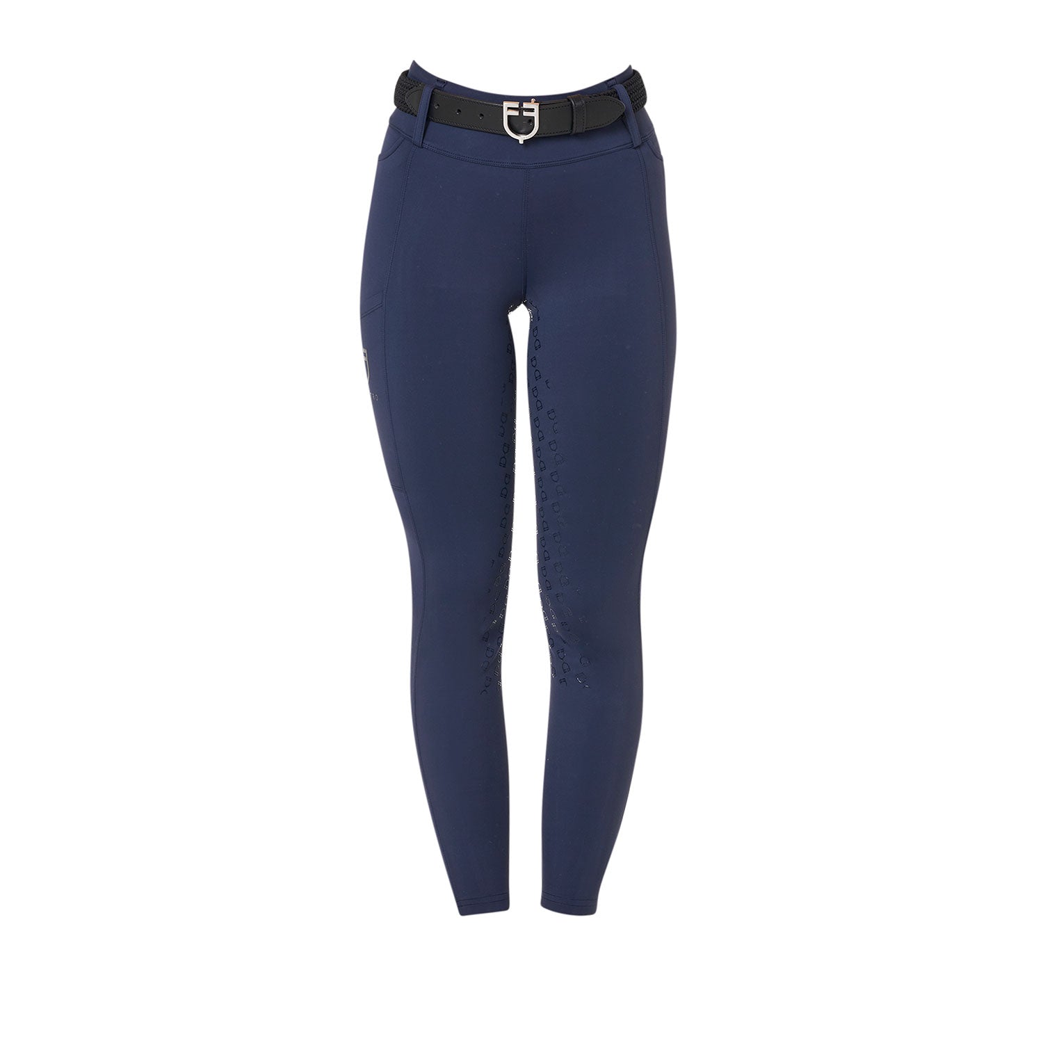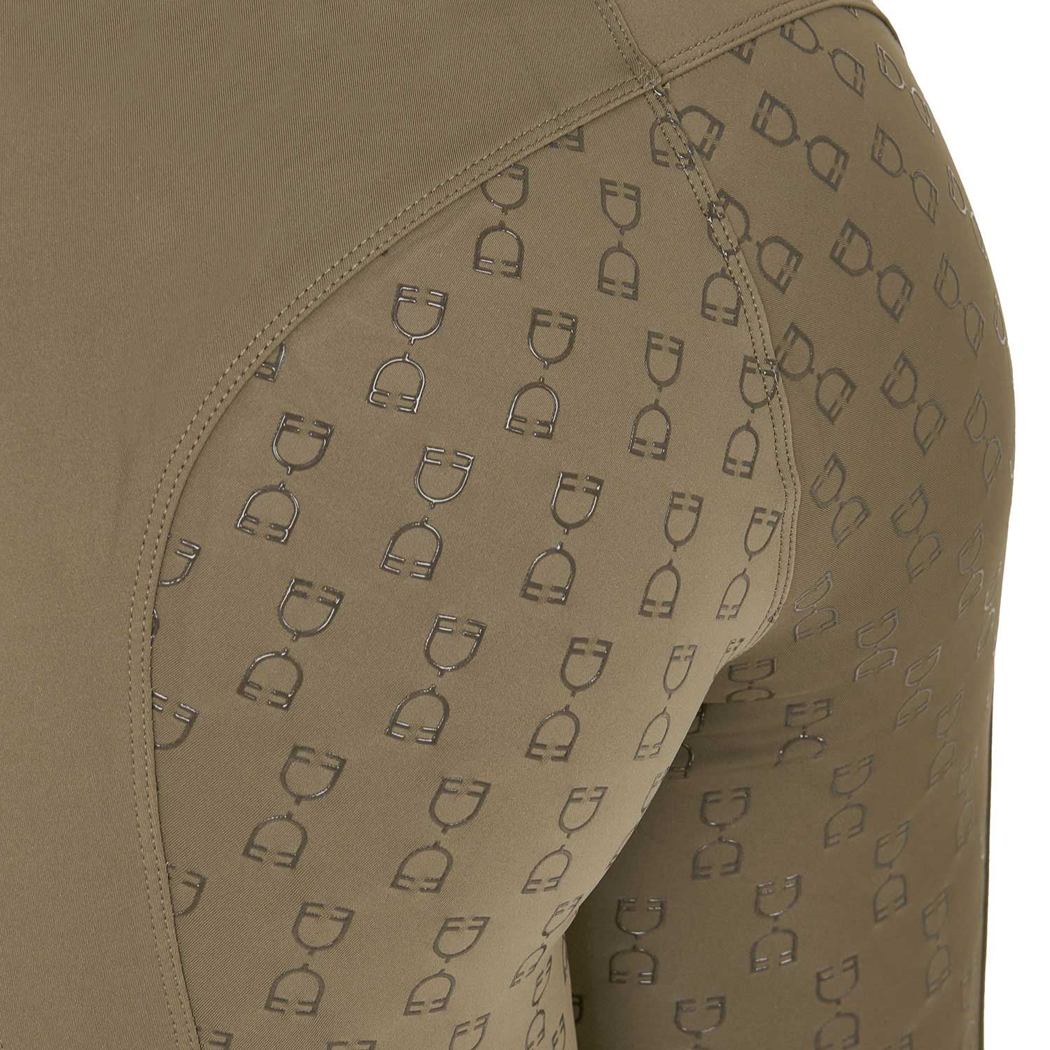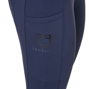 Ridleggings för dam i smal passform (slim-fit) med hög midja och bälthällor, tillverkade i ett tekniskt stretchmaterial. De är bekväma, anpassar sig perfekt efter alla kroppstyper och håller värmen även under de kallaste dagarna. Leggingsen är utrustade med en praktisk dubbel sidoficka, som är dekorerad med ett tryck av Equestros logotyp. Helskodd med silikongrepp (från knät och bakåt) förbättrar stabiliteten i sadeln samt ryttarens balans och sits.