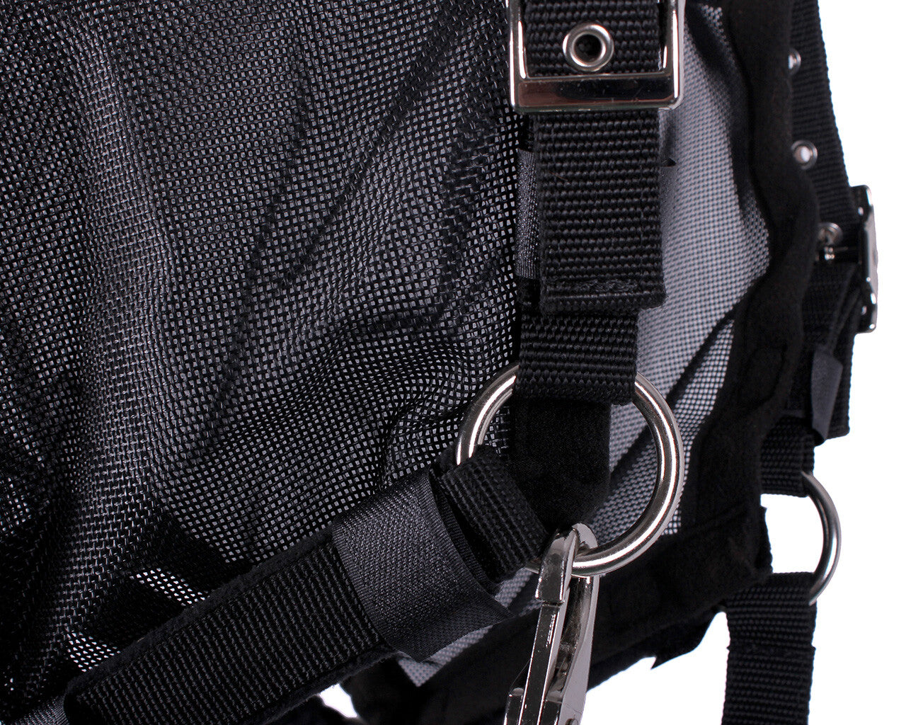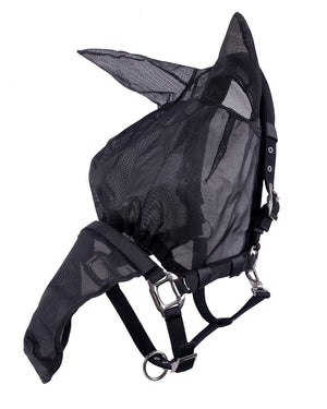 This head collar features a fly mask with ears which is attached with hook-and-loop fasteners. The elastic "noseband" of the mask makes sure the mask fits snugly to the nose. The mask and head collar are fleece lined. The head collar is adjustable at the crown piece and nose band and can be used without fly mask.