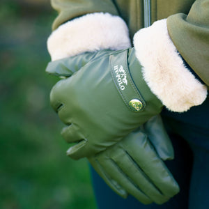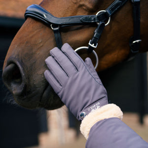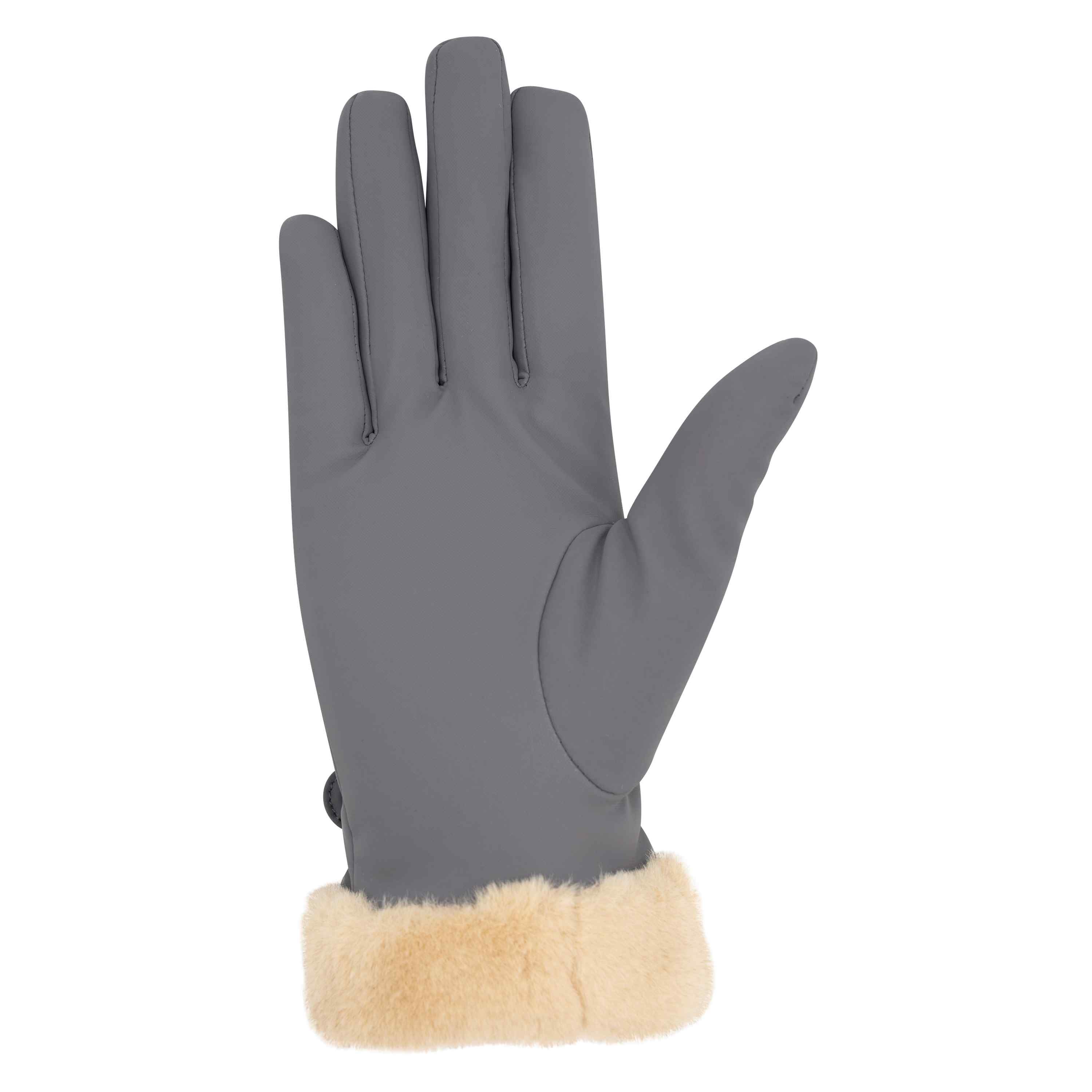 Fashionable glove with soft and warm faux-fur material at wrist with HV metal coin at strap.