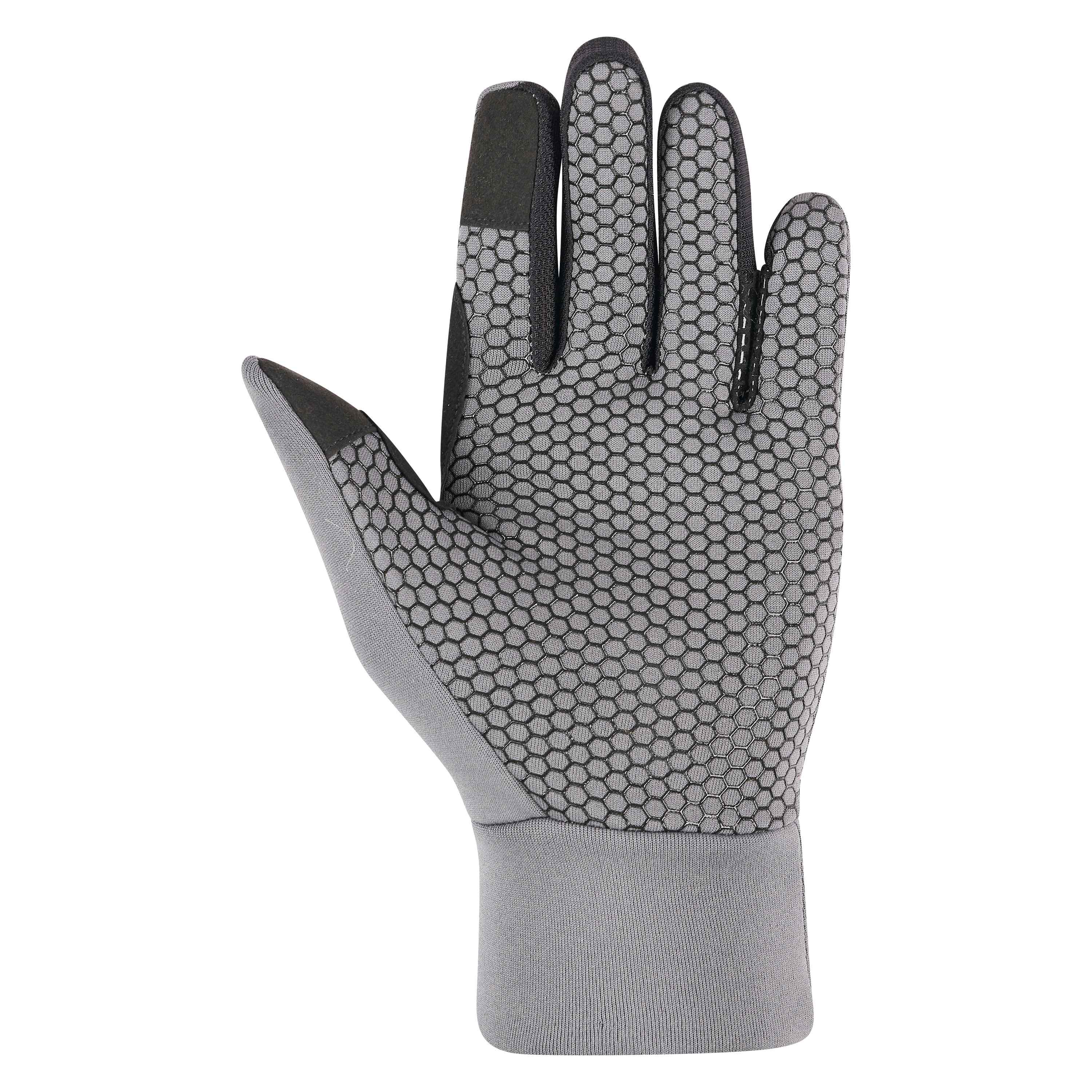 Warm glove with silicone grip print on the inside and mesh details. With touch screen point on forefinger and reflective logo on backhand.