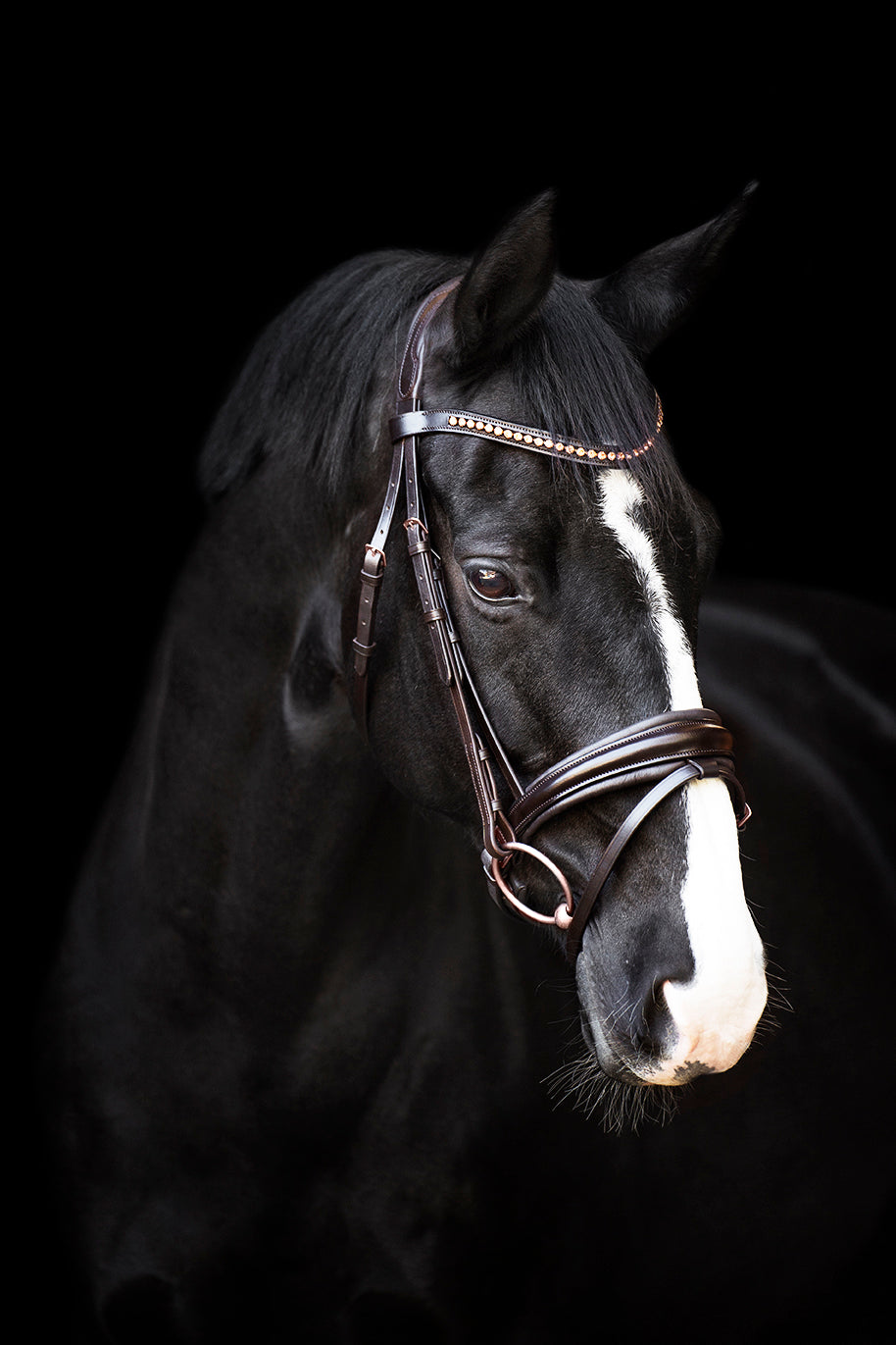 Anatomical shaped snaffle bridle IRHFria. The headpiece and the noseband are anatomical shaped with a soft sheep leather padding. The browband has rhinestones which are inlaid in leather. Bridle is supplied without reins.