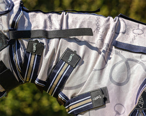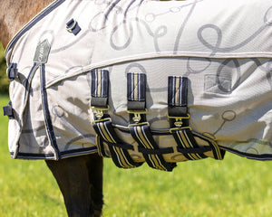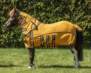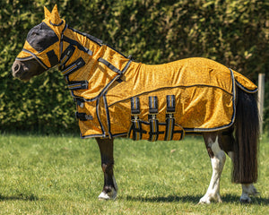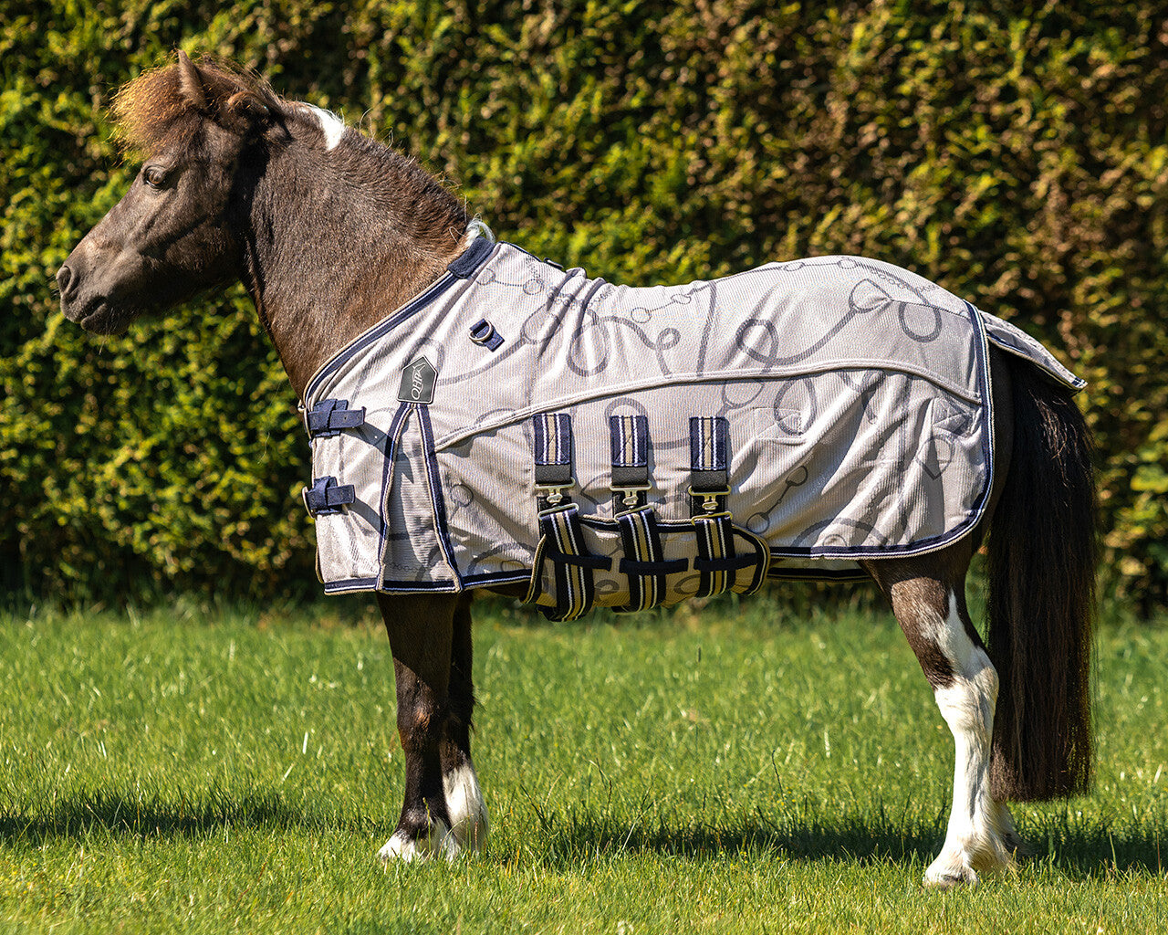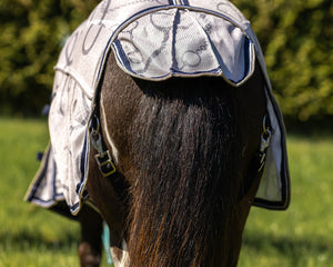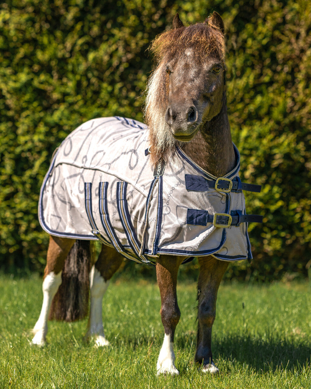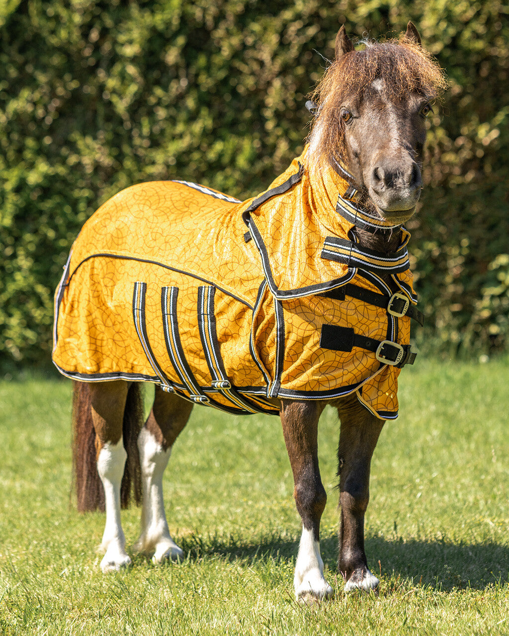 Fabric composition: 100% polyester Fly sheet with a fine mesh with a special fit for Falabellas Detachable neck and hood, which are attached to the rug with hook-and-loop closures The hood is made of sturdy mesh with darts which keep the eyes free Features a nylon insert in the front of the rug and the top of the neck, which prevent rubbing Belly flap and three surcingles with elastic ends Double front closures with buckles Equipped with shoulder gussets, elastic leg straps, tail cord and tail flap Machine washable at 30 degrees. Close the hook-and-loop fastener and wash the rug in a laundry bag. Preferably do not use a fabric softener and do not tumble dry Part of the summer collection 2023