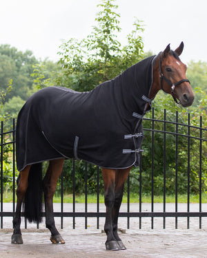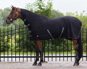 Use a fleece rug after unsaddling a horse to prevent him from cooling down too quickly. The basic fleece rug absorbs sweat very well. This rug is with a double front closure, features cross surcingles and equipped with neck cover.