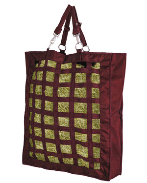Hay bag with a net front made of wide strips of fabric. Features 4 rings on the tops with adjustable loops to hang the bag. The loops can be ran through the rings to close the bag.