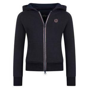Get cozy in our new sweat hoodie! Made with a soft, brushed interior to keep you warm and comfortable all day long. Featuring a stylish 2-way zipper closure at the front, insert pockets for your essentials, and thumbholes at the cuffs for added warmth. Stand out with the glittery artwork at the chest and a shiny logo print at the back neck. Complete with a branded metal charm at the bottom for that extra touch of style. Stay fashionable and comfortable with our sweat hoodie!
