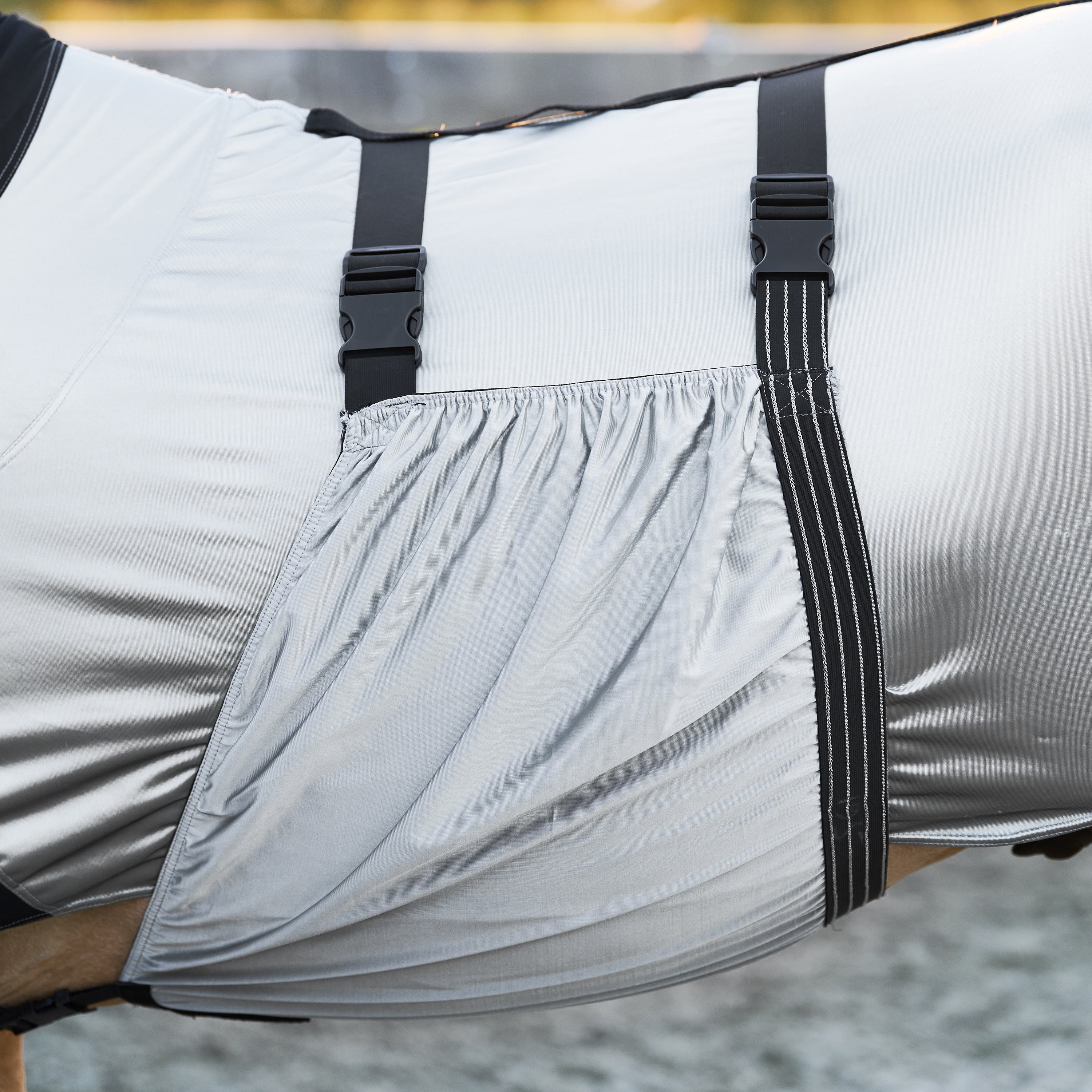 Our Eczema blanket with Belly Band and Neck with stretch fabric provides a comfortable, breathable barrier against bothersome bugs. A generous tail guard gives additional coverage, and we especially love the belly guard feature for horses that are prone to insect allergies and sweet itch. Simply machine wash and dry for the easiest of care!