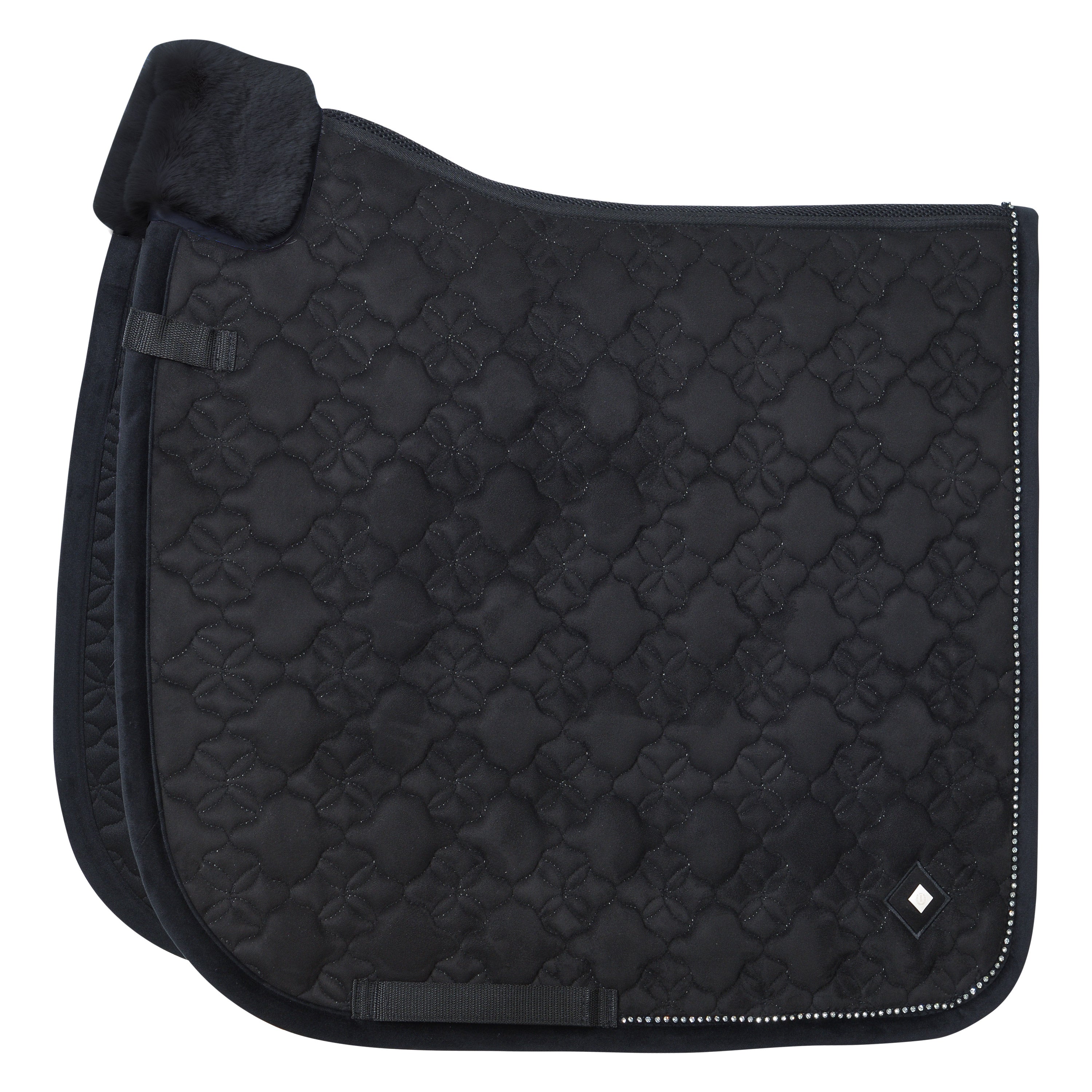 All saddlepads with tonal fur * Fur can be taken off * Rhinestone edge * Suede outer fabric * Velvet binding * Cotton poly lining