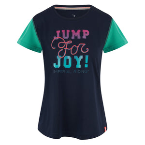 Jump for joy! Glittery and colorful artwork at chest, contrast sleeves and special sporty fabric.