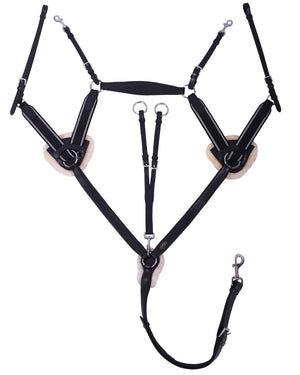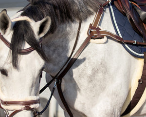 Five-point breast plate with removable martingale fork and imitation fur lining on the shoulders and chest. Prevents the saddle from shifting backwards when jumping. The elastic with white stripes provides greater freedom of movement and shock absorption.