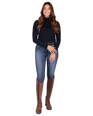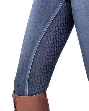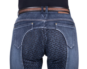 Beautiful demin riding breeches. The tough riding breeches have a full grip pattern and both front and back two side pockets. The denim fabric provides a cool look.