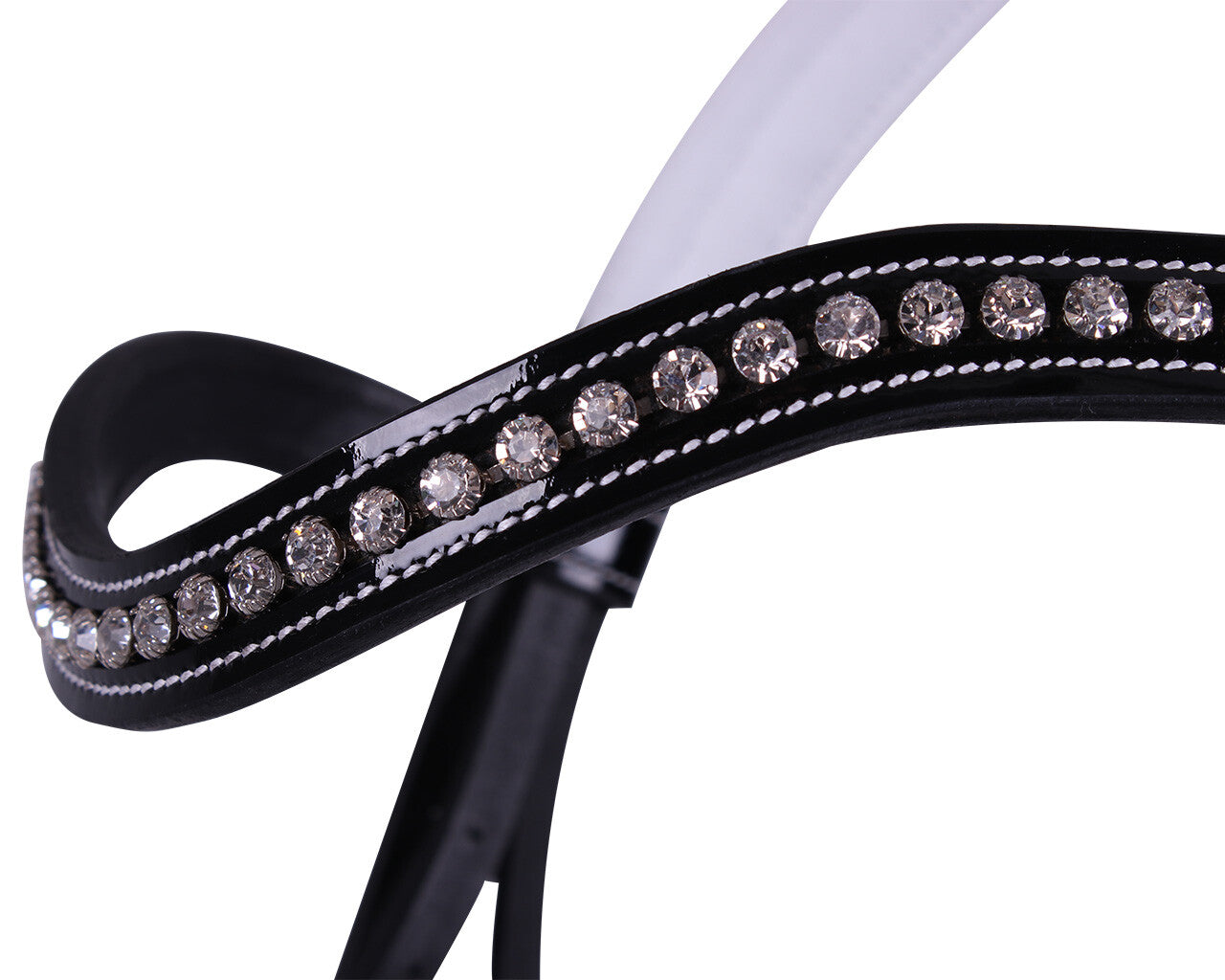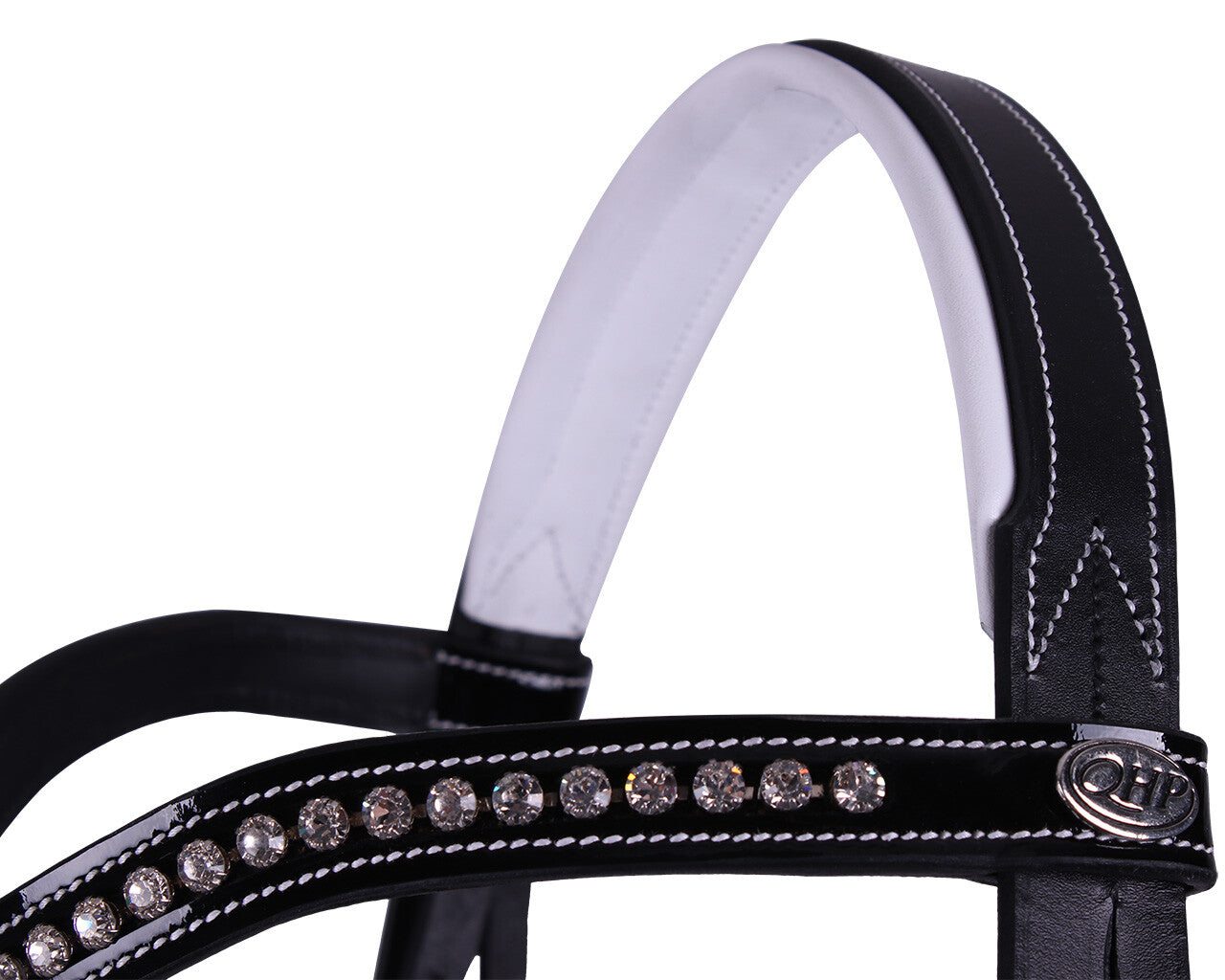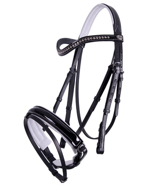 The finishing with white stitching and the corresponding white leather padding give this bridle a striking black/white colour scheme. The brow band is finished with large rhinestones. The bridle has hook studs on the cheek pieces and a patent leather noseband.