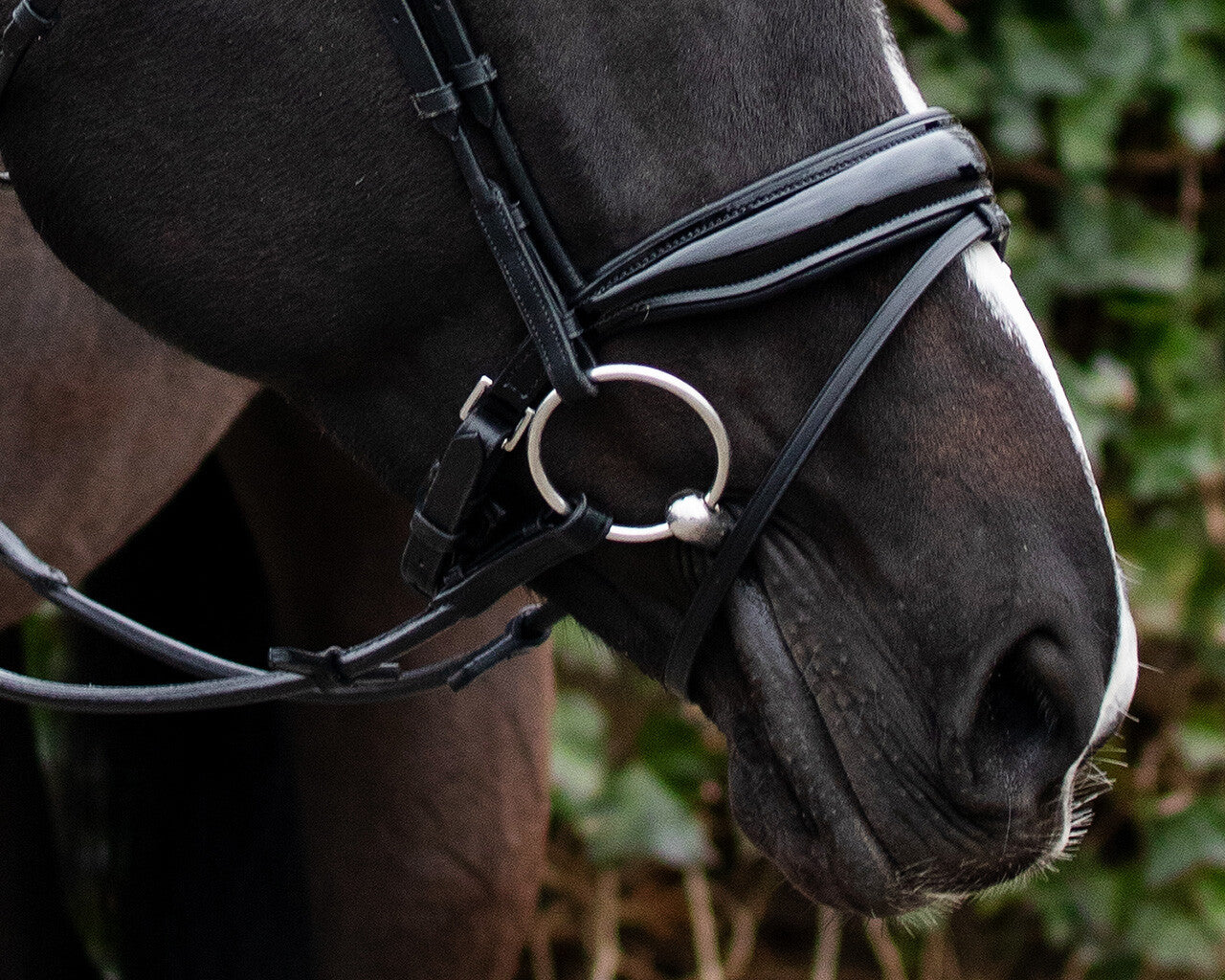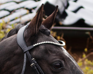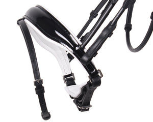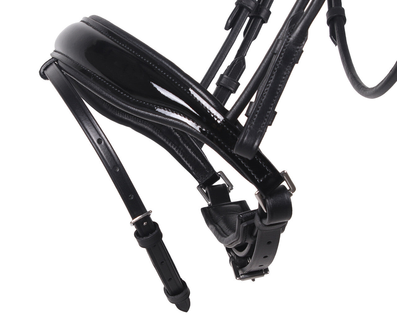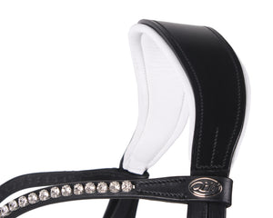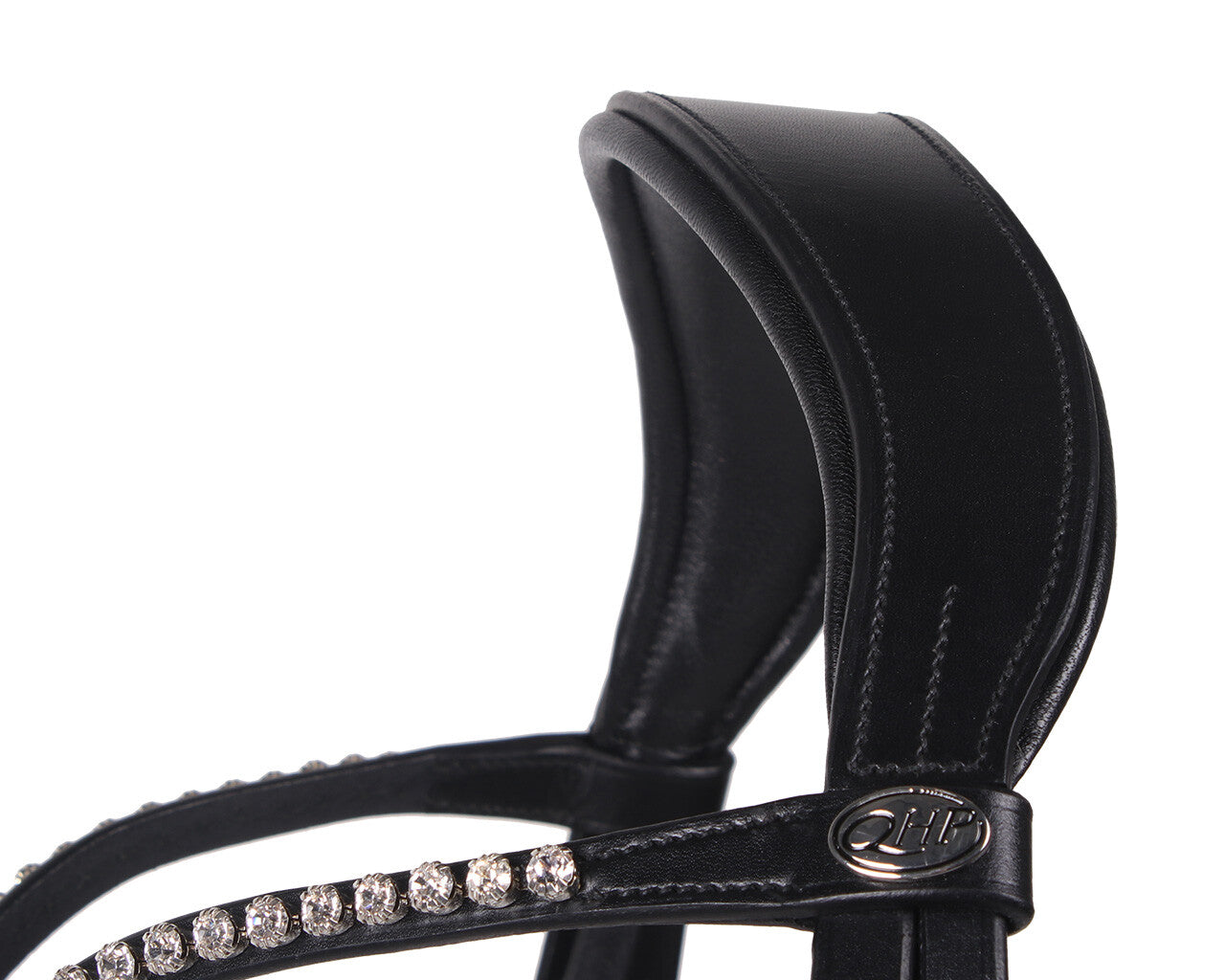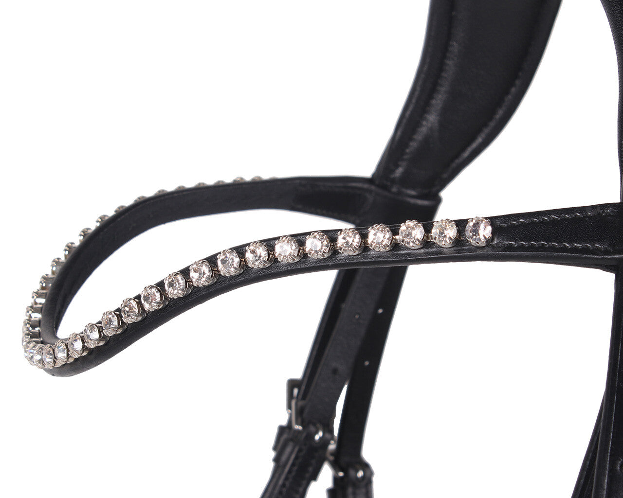 The Nehza bridle gets its chic look from the round stitched buckles, patent leather noseband and browband with rhinestones. In addition, the bridle is comfortable for the horse thanks to the soft padding, the wide anatomically shaped headpiece and the anatomically shaped noseband with cut outs for the bit.