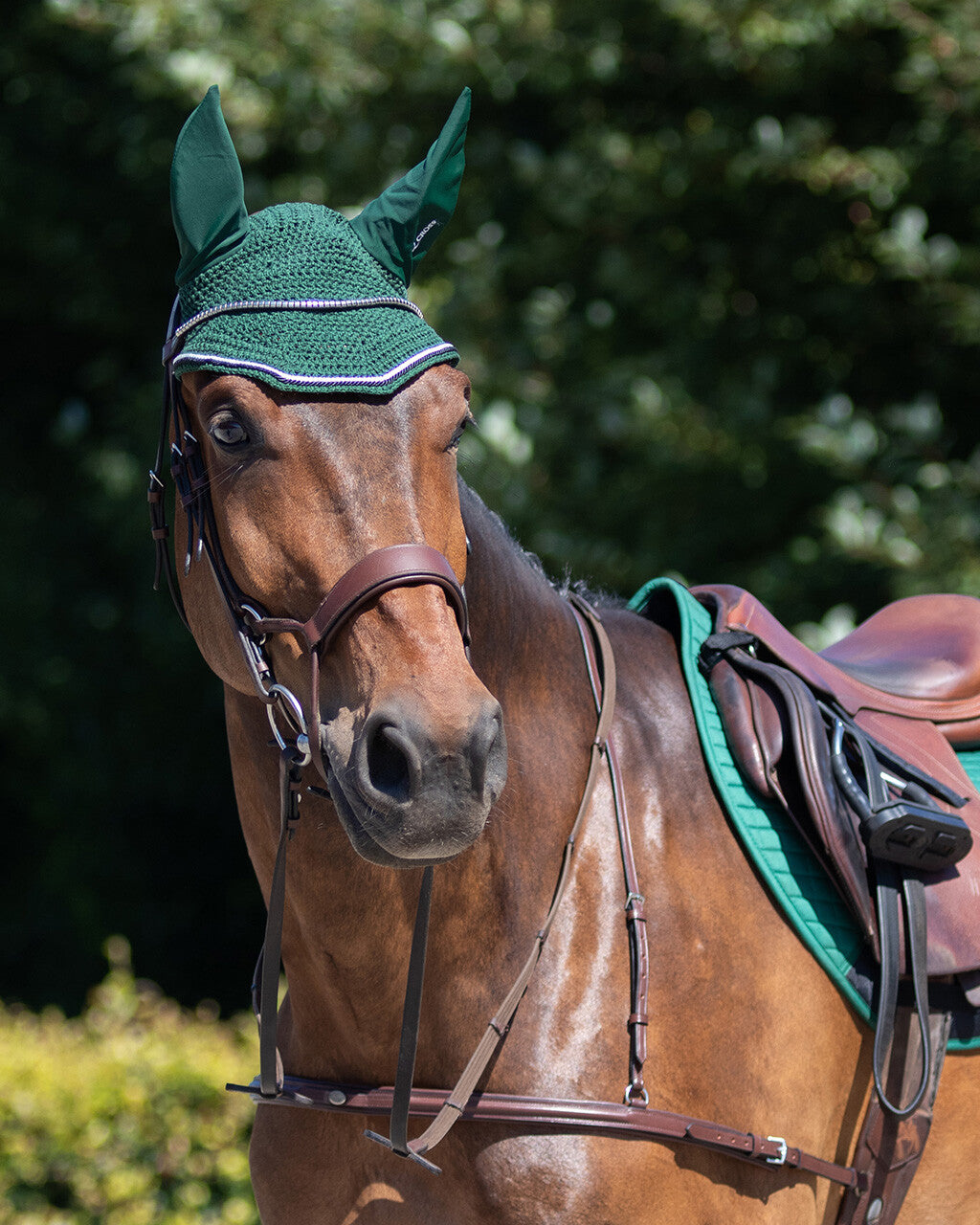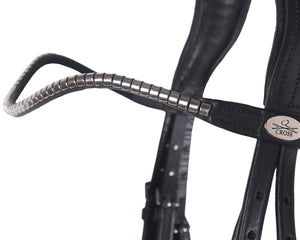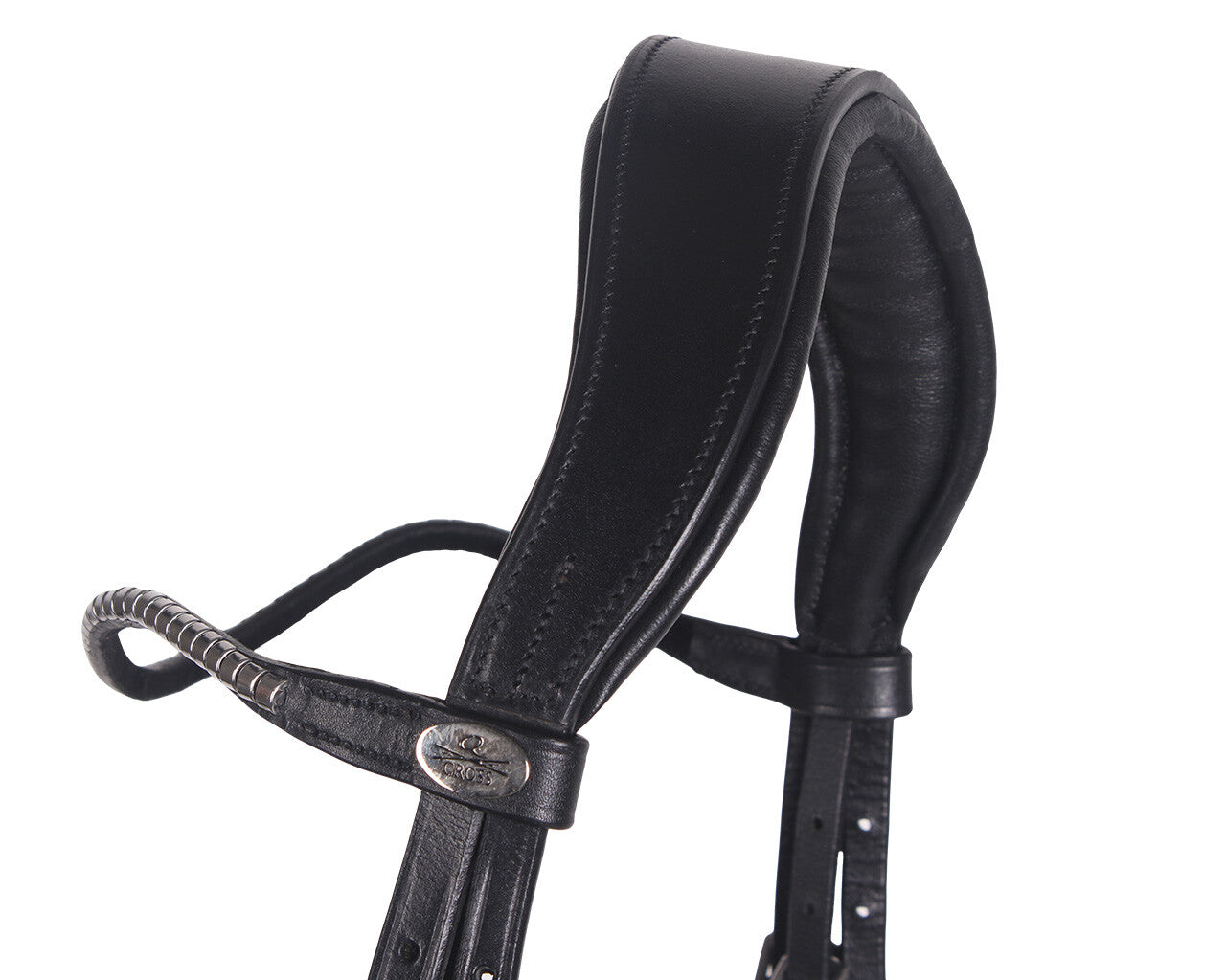 This bridle is specially designed to avoid the nerves on the horse’s head and to distribute the pressure evenly. The special shape of the noseband ensures that the facial crest (jawbone line) and the attachment of the face nerve are avoided. The anatomical crown piece avoids pressure on the ear muscles. The extra wide crown piece distributes the pressure better and the pressure on the neck attachment muscles is minimized. Both the noseband and the crown piece feature gel padding which forms to the shape of the horse.