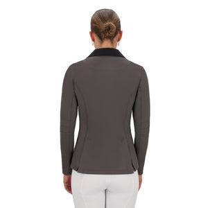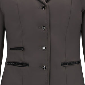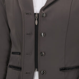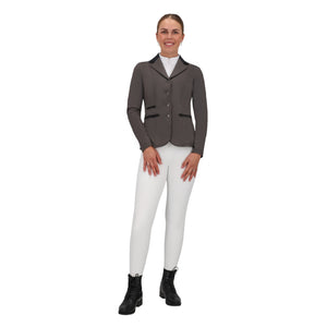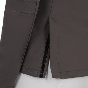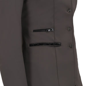 Shine during your competition with this chic competition jacket. The jacket has a concealed zipper behind the button closure so that the buttons won't pull. The stretchy, breathable fabric ensures a comfortable ride and is also water-repellent. The glitter tape on the zip pockets and black faux zip pocket complete the jacket.