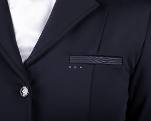 Can you see yourself appearing in this chic competition jacket? Follow the trends and grab your chance. The Kae competition jacket has a subtle print on the pockets and collar. The jacket has a professional look thanks to the split on the back and the luxurious Q-buttons on the front.