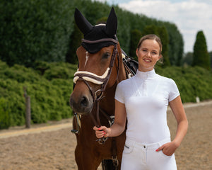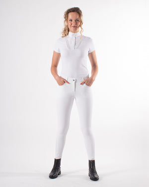 Sporty competition shirt decorated with pleated details on the front. The shirt has a hidden zipper with button. The collar can be closed with a pearl button. The shirt is finished with an embroidered "Q" and a rhinestone on the front.
