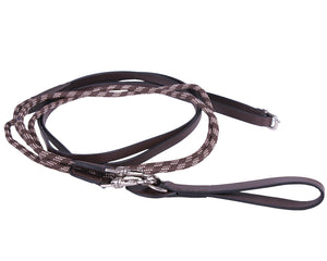 Leather draw reins decorated with a bicolour cord. Girth loop attachment and two strong snaps.