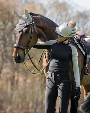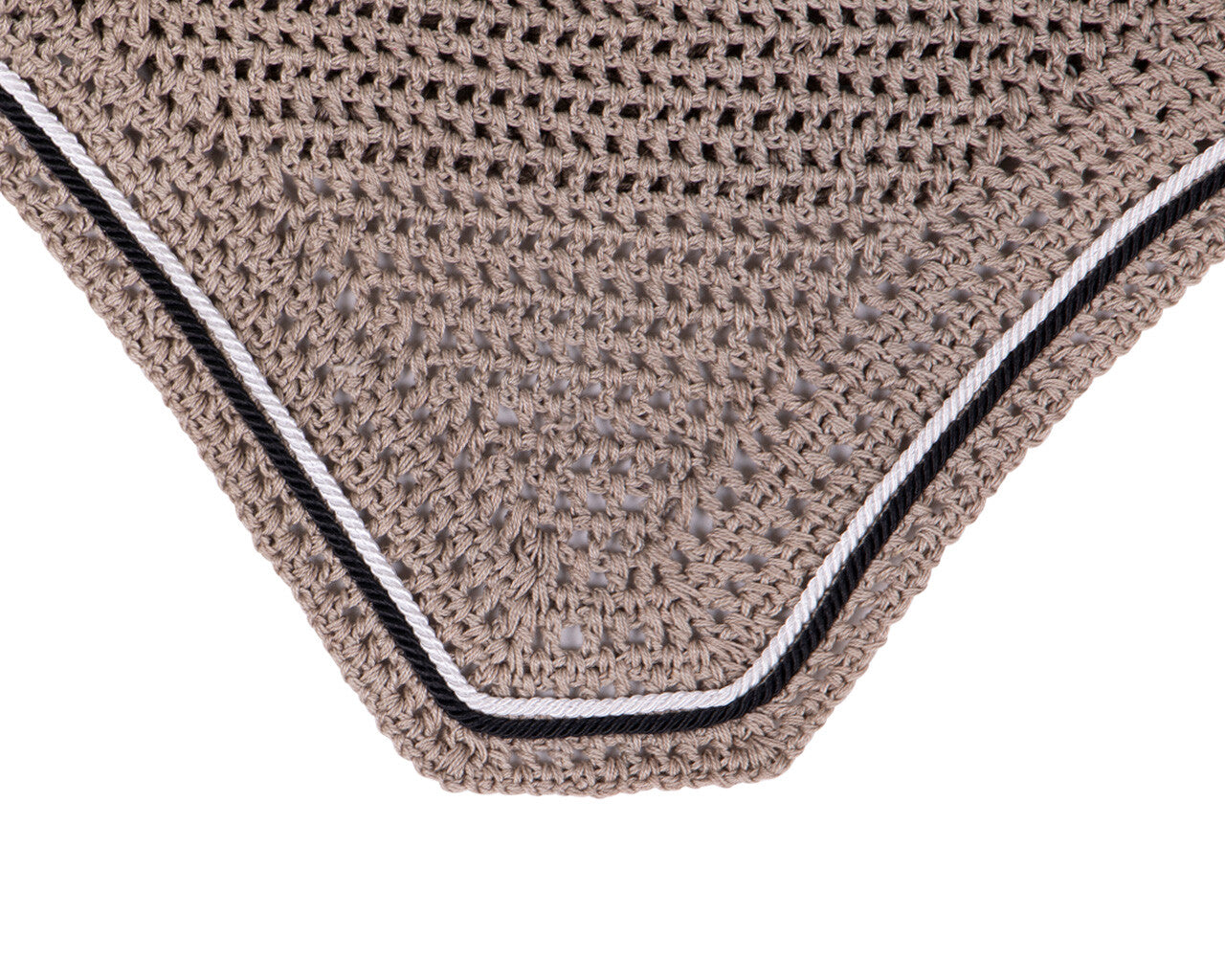 Crochet ear net with elastane ears which completes your Q-Cross outfit. The ear net is decorated with two small cords along the edge. Finished with a Q-Cross embroidery on the left...