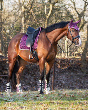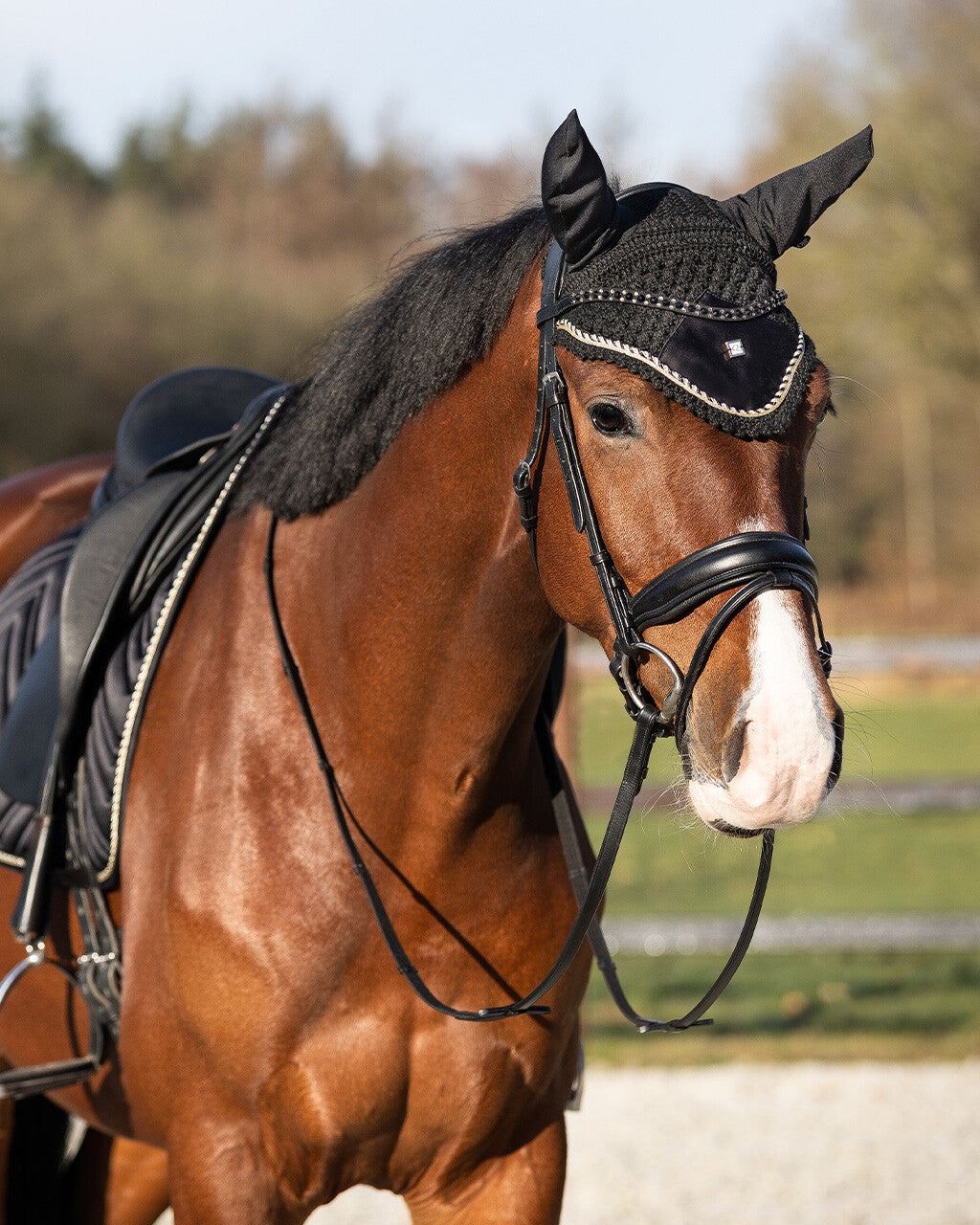Yes! This ear net from the Menton collection is indispensable in your tack room. The ear net is luxuriously crocheted and has a chic three-colour decorative cord. The golden shades of the Menton collection are reflected in this ear net. It also features a luxurious Q-pin.