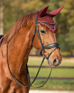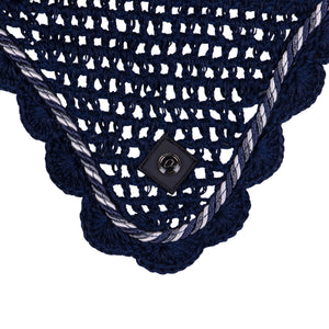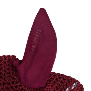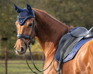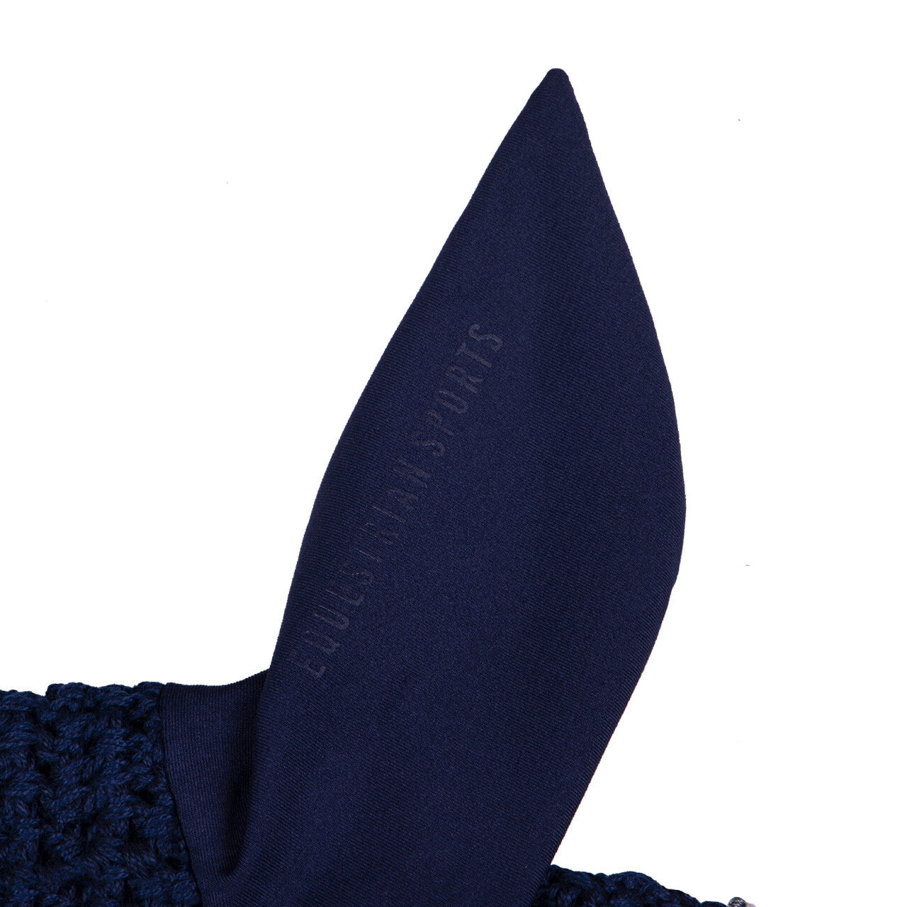 This ear net is great. A chic ear net with a beautiful decorative cord. The ear net has a Q-pin on the front and the text 'Equestrian sports' on the left ear.