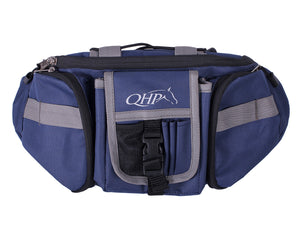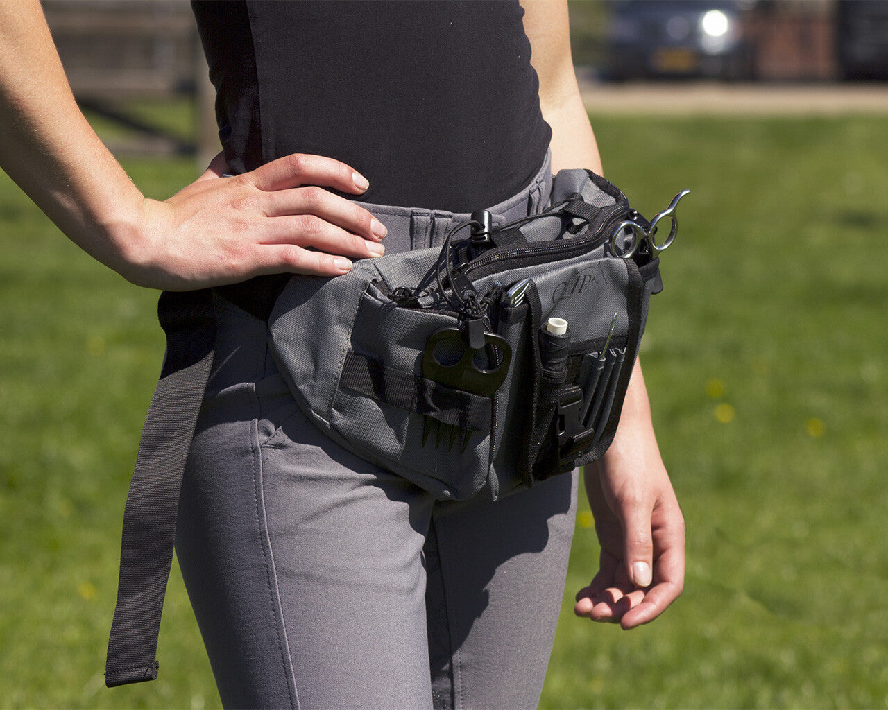 Hip bag with several pockets to store all items necessary for grooming and braiding. Because of the belt you can wear the bag during grooming or braiding and have all of the items close to you. The bag is provided with grooming items.