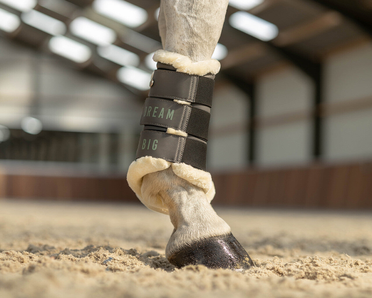 Set of two sporty looking, flexible leg protectors that can be used for both the front leg and the back leg. The protector features a soft faux fur lining and contains elastic hook and loop fasteners. The inside is reinforced so that the leg is well protected against tapping.