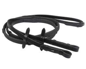 Rubber antislip reins with studs for good grip. Finished with leather, martingale stops and hook studs.