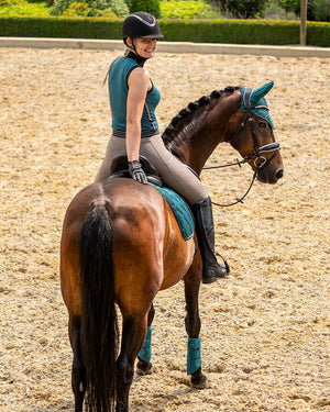 Go for comfy with riding tights Benthe! The elastic waistband with the text "Equestrian Sports" and the embossing on the pockets with the saddlery print give these riding tights a sporty look.