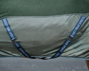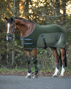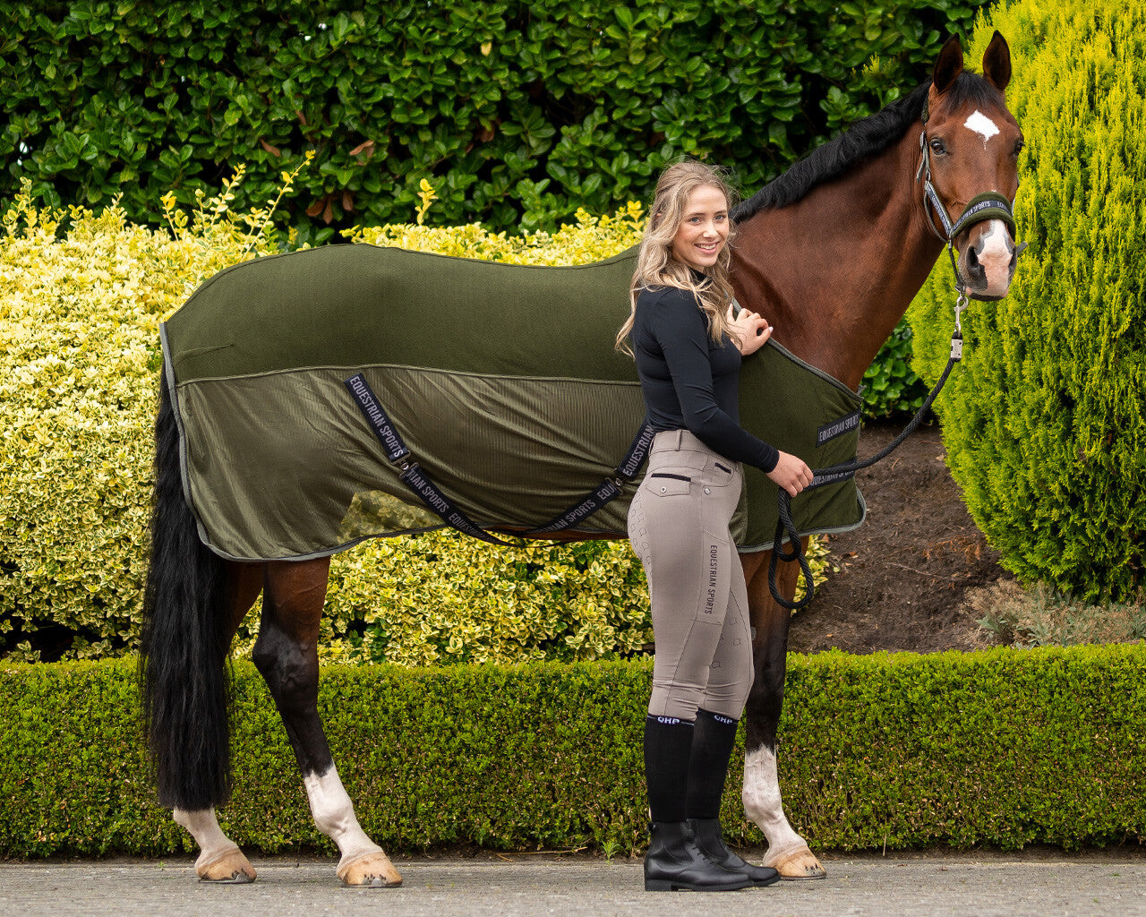 Breathable rug with the text 'Equestrian sports' on the girths. Ideal to use during transport or after horseriding. This rug is part of the Jorine collection.